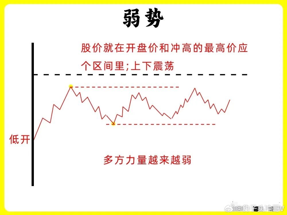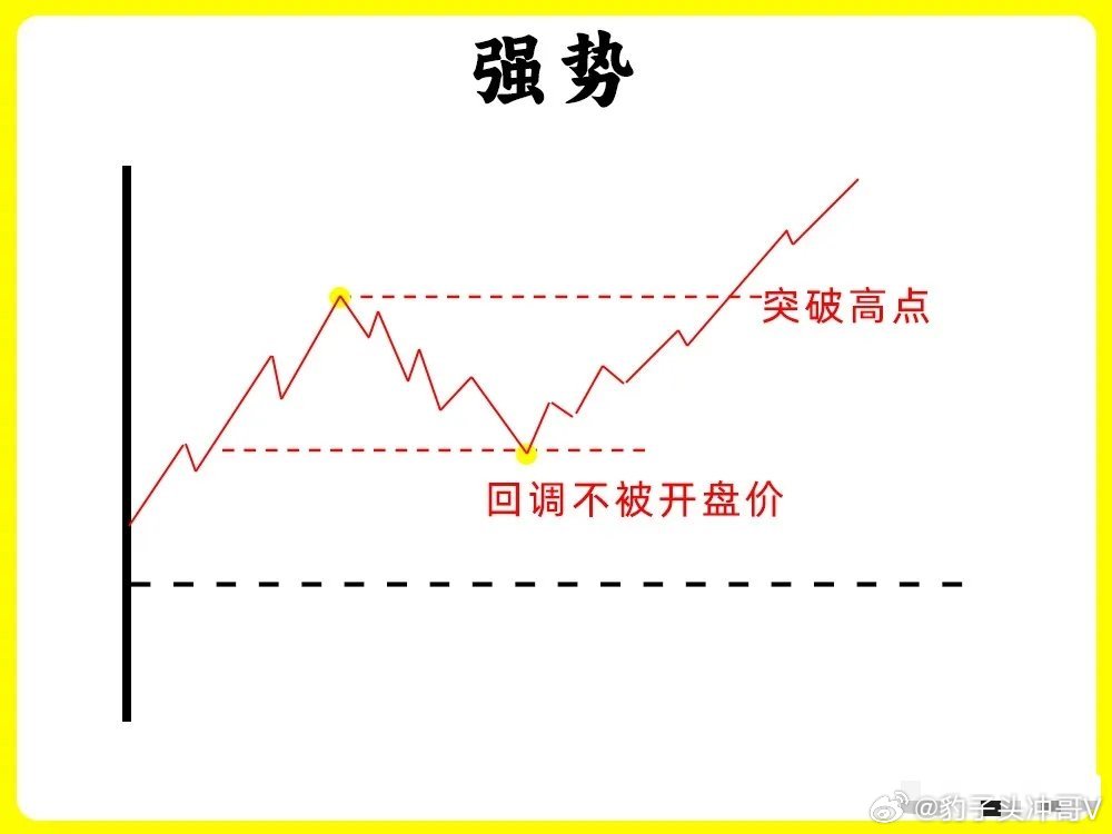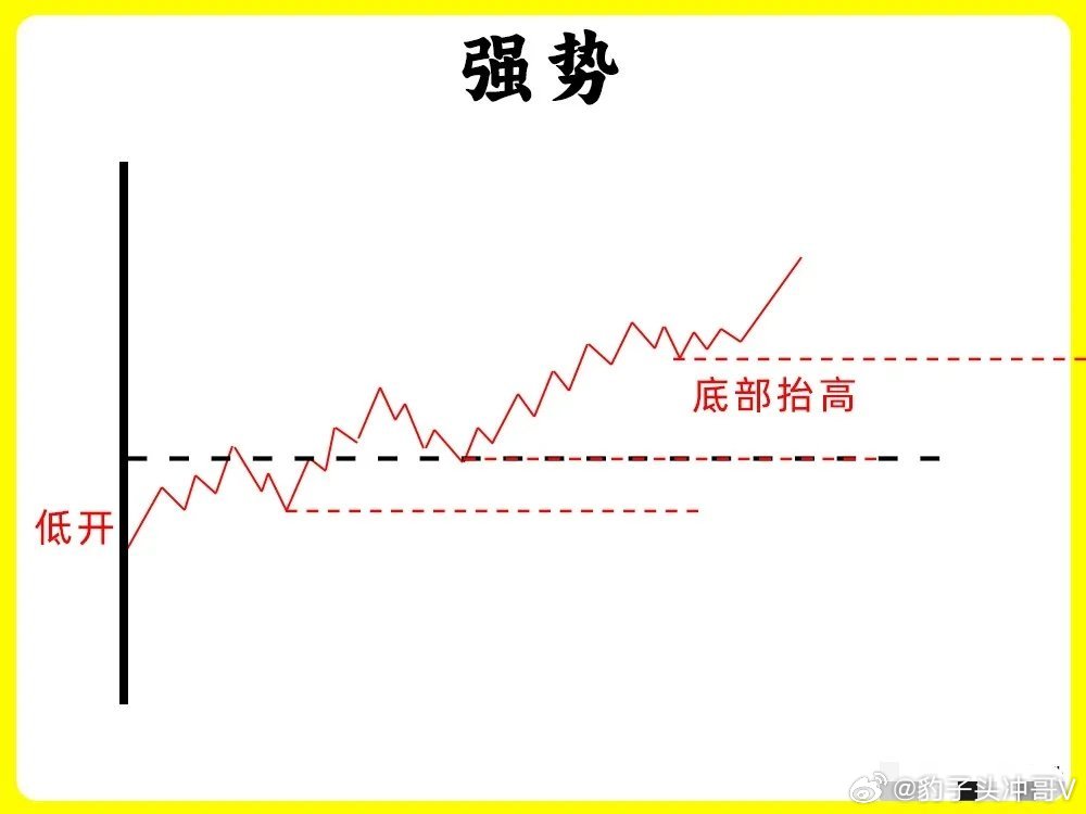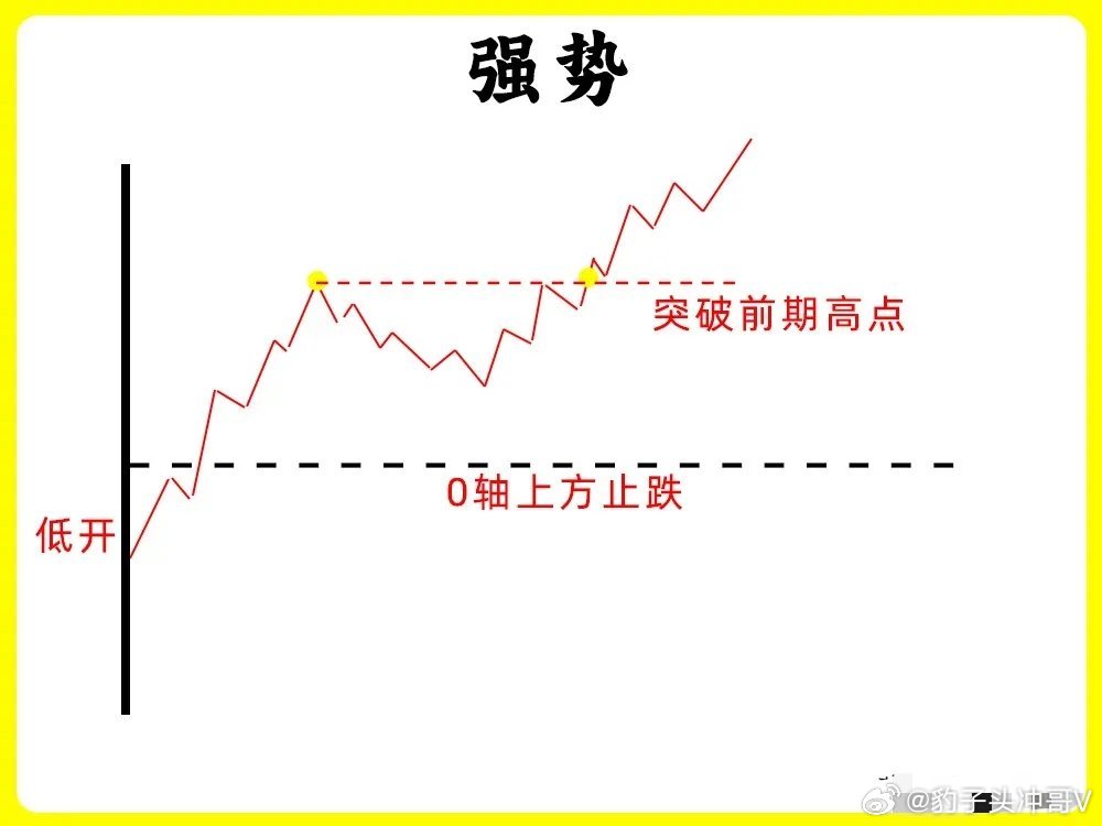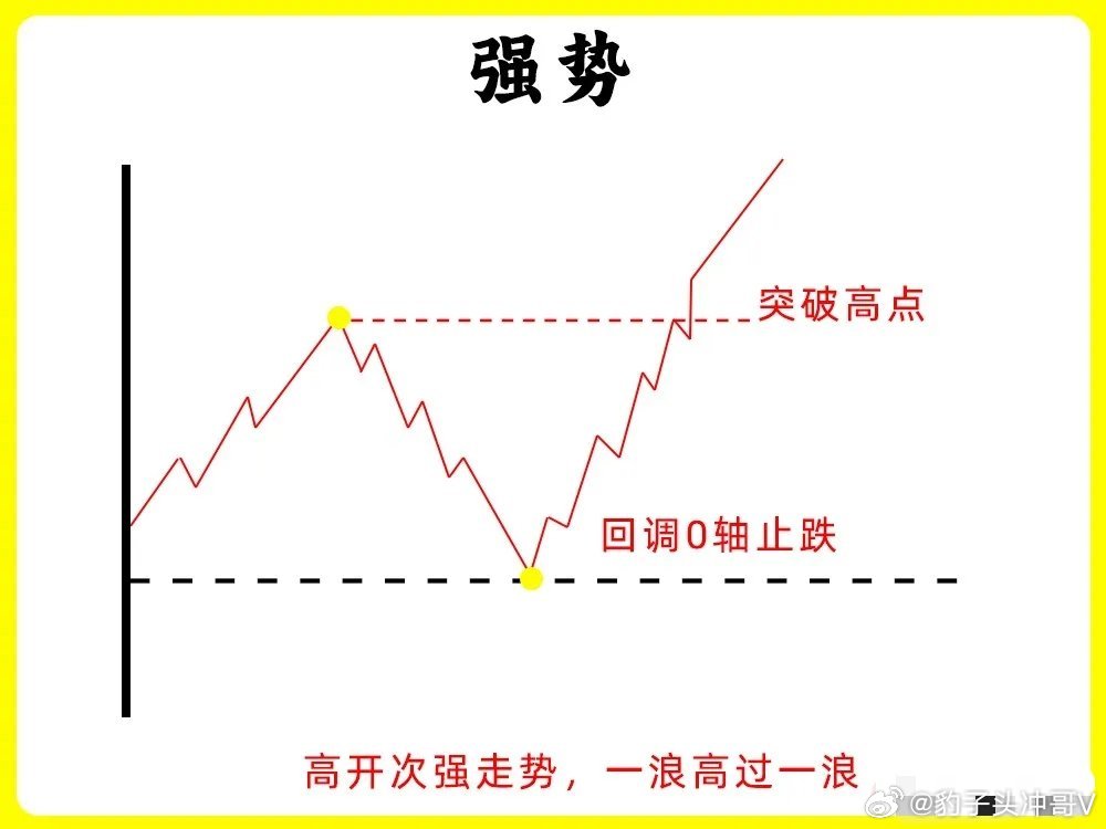 第一种股价高开以后,开始上涨形成一个高点,随后股价开始回调,回调不破开盘价,开始止跌企稳,随后反弹向上,突破早盘的高点,强势第二种股价高开以后,开始上涨,出现前期高点,随后开始回调,但是回调不破昨日收盘价,也就是0轴上方,开始止跌向上,突破高点,创当天新高,强势第三种股价早盘低开,随后继续下跌,反抽形成一个高点,高点低于开盘价,继续下跌,整个过程里,股价高点都在降低,这是明显下降通道,弱势第四种股价早盘低开,随后冲高,但是都没有翻红,形成一个高点以后开始回调,整个过程里,股价就在整个高点和回调低点,来回震荡,弱势第五种股价低开以后,开始冲高,触碰0轴,随后调整以后,继续冲高,整个过程,股价高点都不断抬高,低点也抬高,,形成上升通道,强势第六种这种形态和第二种很相似,股价早盘低开以后,开始冲高,在0轴上方运行,形成形成一个高点,随后股价开始回调,在0轴附近开始止跌,反弹向上,突破早盘高点,创下新高,强势股市有风险,投资需谨慎!