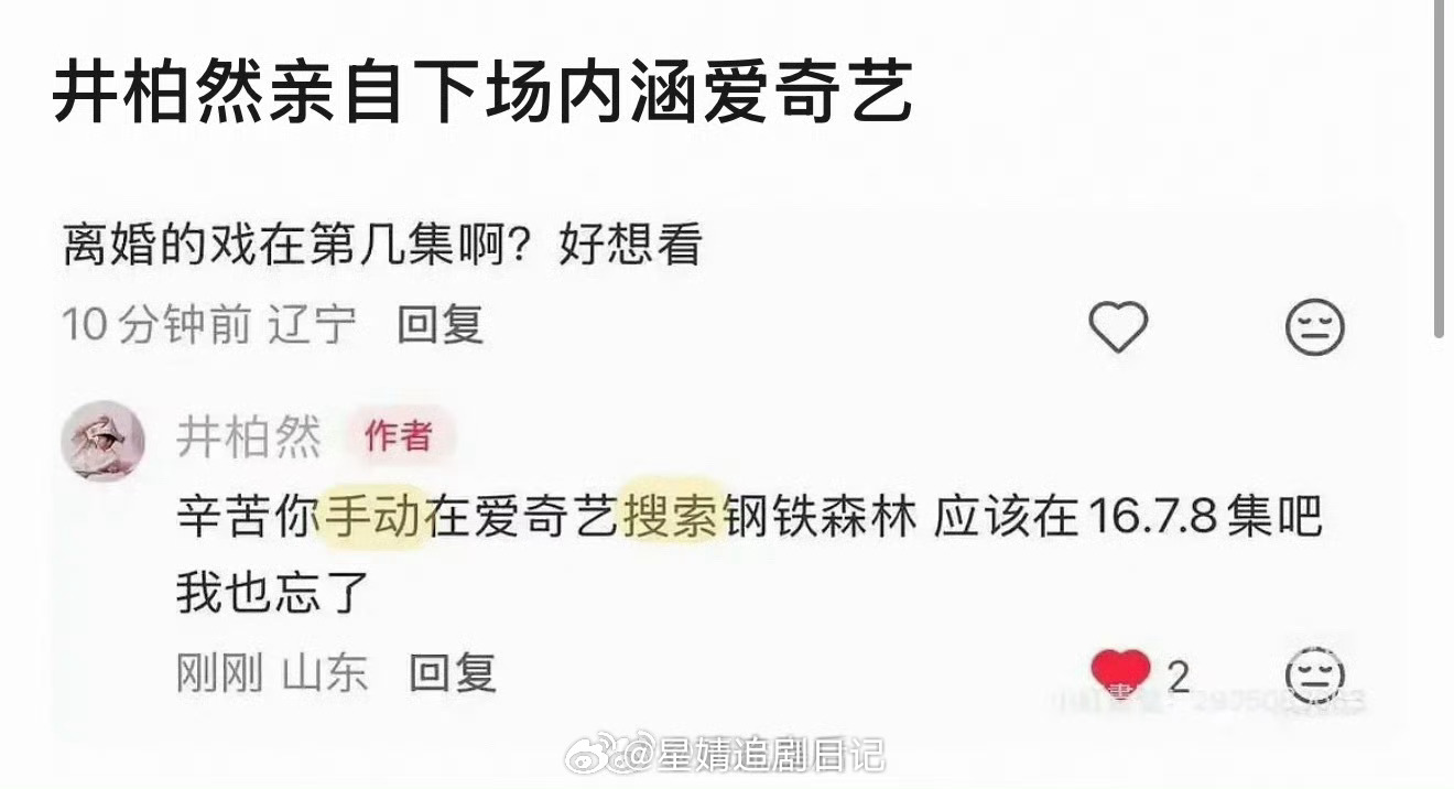 井柏然回复网友在爱奇艺搜索钢铁森林看剧被网友质疑内涵待遇不好。在钢铁森林里江寒声一些高光戏份被删掉了…其实内娱不是很喜欢这种活人感很强的明星,因为他们的回复会引起一些争议不像在解释,更像是在内涵~看了一下钢铁森林爱奇艺给的待遇其实蛮好的,首页有固屏也有专栏,但播到现在最高热度只有6480,首播1广,之后裸播,剧情也一直没什么讨论度,播出效果很差!火力全开🌚
