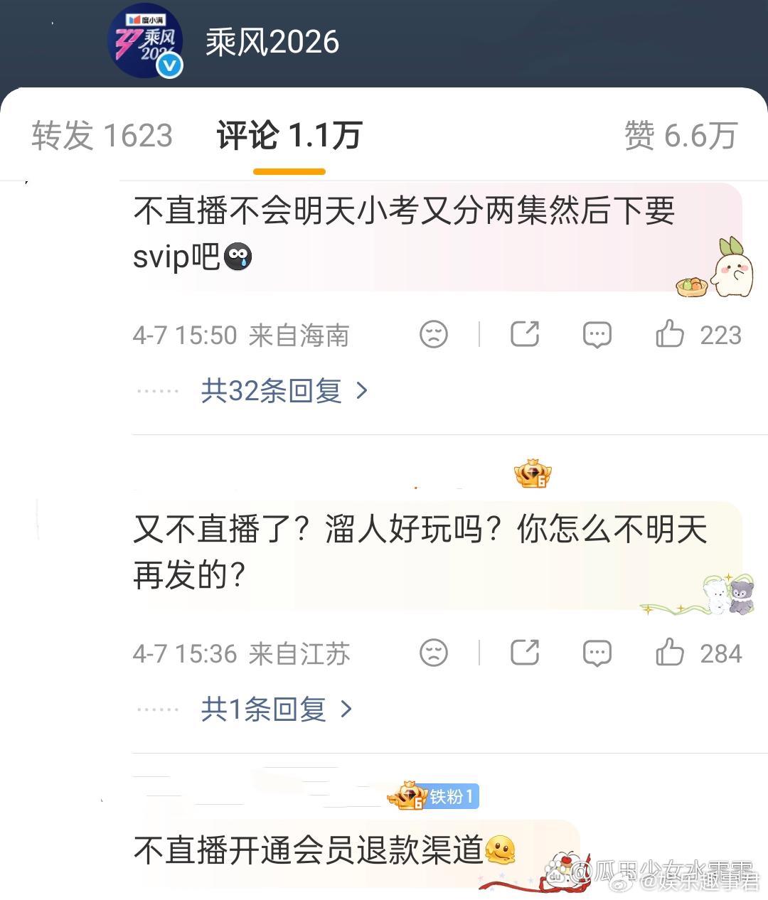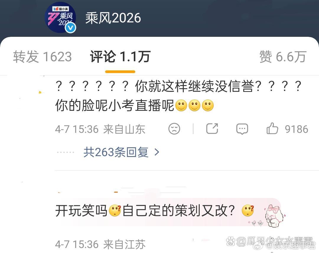 乘风2026原定的一公小考直播改为录播,节目评论区吐槽声一片……
