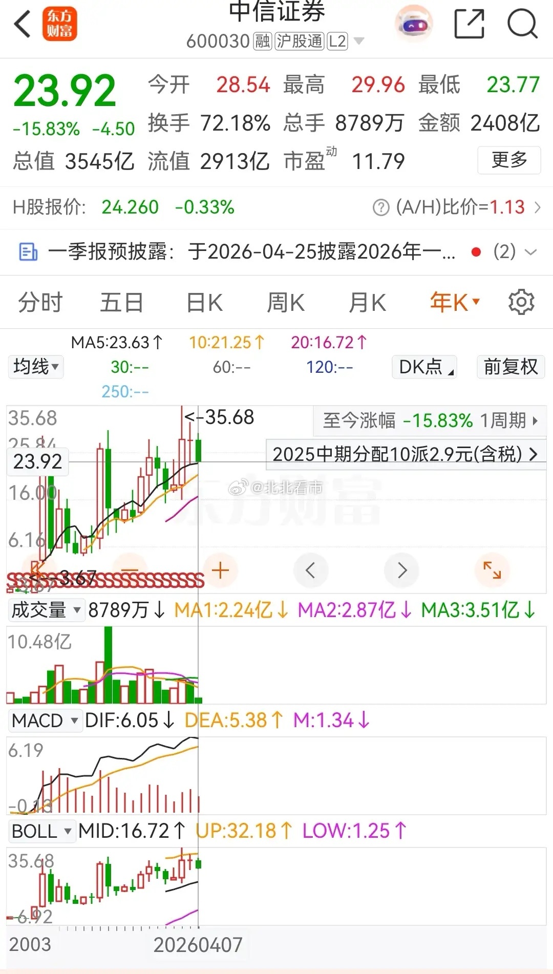 中信证券的走势同东财一样,也是小幅高开冲高后跳水,盘中创出本轮调整新低价 23.77 元后开始回升,最终在低位收出了一颗缩量十字星线,全天的跌幅为0.25%,收盘报价为23.92元。在资金流向上,今天被主力资金净卖出0.9536亿元,近五个交易日则是被主力资金合计净卖出了5.5188亿元。从走势上看依然处于破位下行态势之中,截止今天收盘时为止,券商一哥中信证券在2026年的累计已经达到了15.83%。