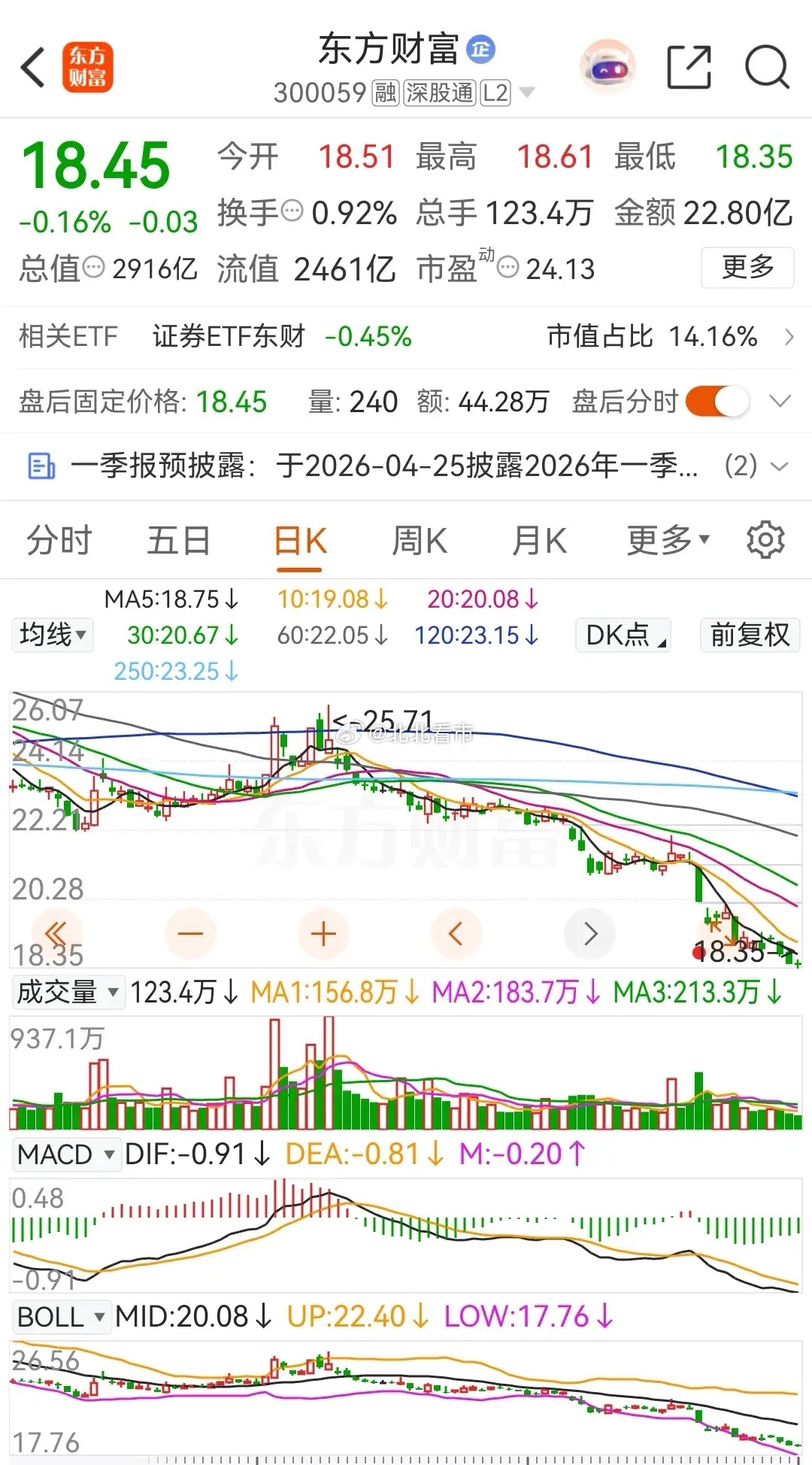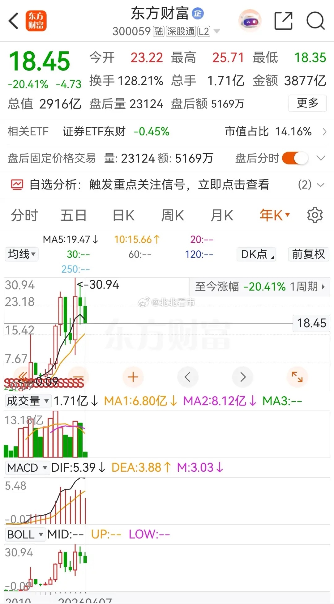 东方财富和中信证券今天继续下跌,再次创出本轮调整新低,在2026年的累计跌幅分别高达20.41%和15.83%。券茅东方财富今天小幅高开冲高后跳水,盘中创出本轮调整新低价 18.35元 ,下跌幅度为0.16%,收盘报价为18.45元。在资金流向上,今天被主力资金净卖出了约3.6316亿元,暂时被主力资金连续三天净卖出,而近五个交易日得合计净卖出金额为15.8493亿元 。从走势上看,当前的券茅东方财富仍然处于破位下跌态势之中。截止今天收盘时为止,东方财富在2026年的累计已经达到了20.41%。