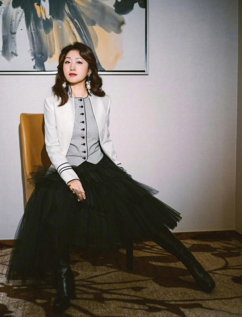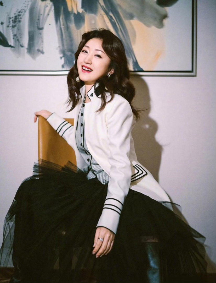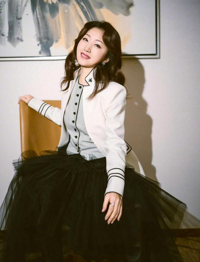 高圆圆以高丸子头搭配白针织衫与彩虹条纹阔腿裤亮相,造型清爽灵动,松弛感拉满。无