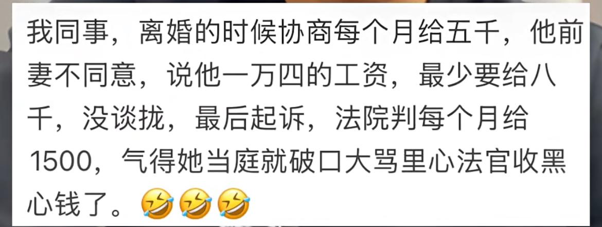 一个单位的同事要离婚,给他老婆 5000 的抚养费,老婆狮子大开口要 8000,理由是他有 1 万 4 的工资,协商不成。老婆诉讼到法院,结果法院才判了 1500,老婆听完判决后差点破口大骂法官。 说明这个男人是比较有担当的,虽然要和老婆离婚,对老婆依然存有感情,1 万 4 的工资,愿意拿出 5000,自己只剩 9000,要吃喝拉撒,可能还要存点钱为以后结婚做打算,这已经做的够仁至义尽了,没想到他老婆有点贪得无厌,想把人家榨干抹净。 法官判决可不会掺杂什么私人感情,人家就是按照法律法规来判的,该给多少就给多少,绝对不会多判。 多给其实全看当事人的良知,和法律没有什么关系。现在这个女人就要为自己的贪得无厌付出代价,不仅没有捞到更多,反而损失更大。在离婚的时候,作为弱势一方的女人,最好见好就收。