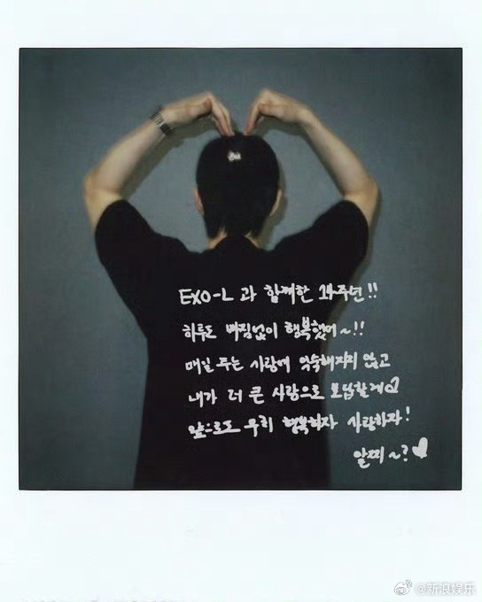 EXO庆祝出道14周年 4月8日是EXO出道14周年,官推晒出成员背影+手写信拍立得,WE ARE ONE!
