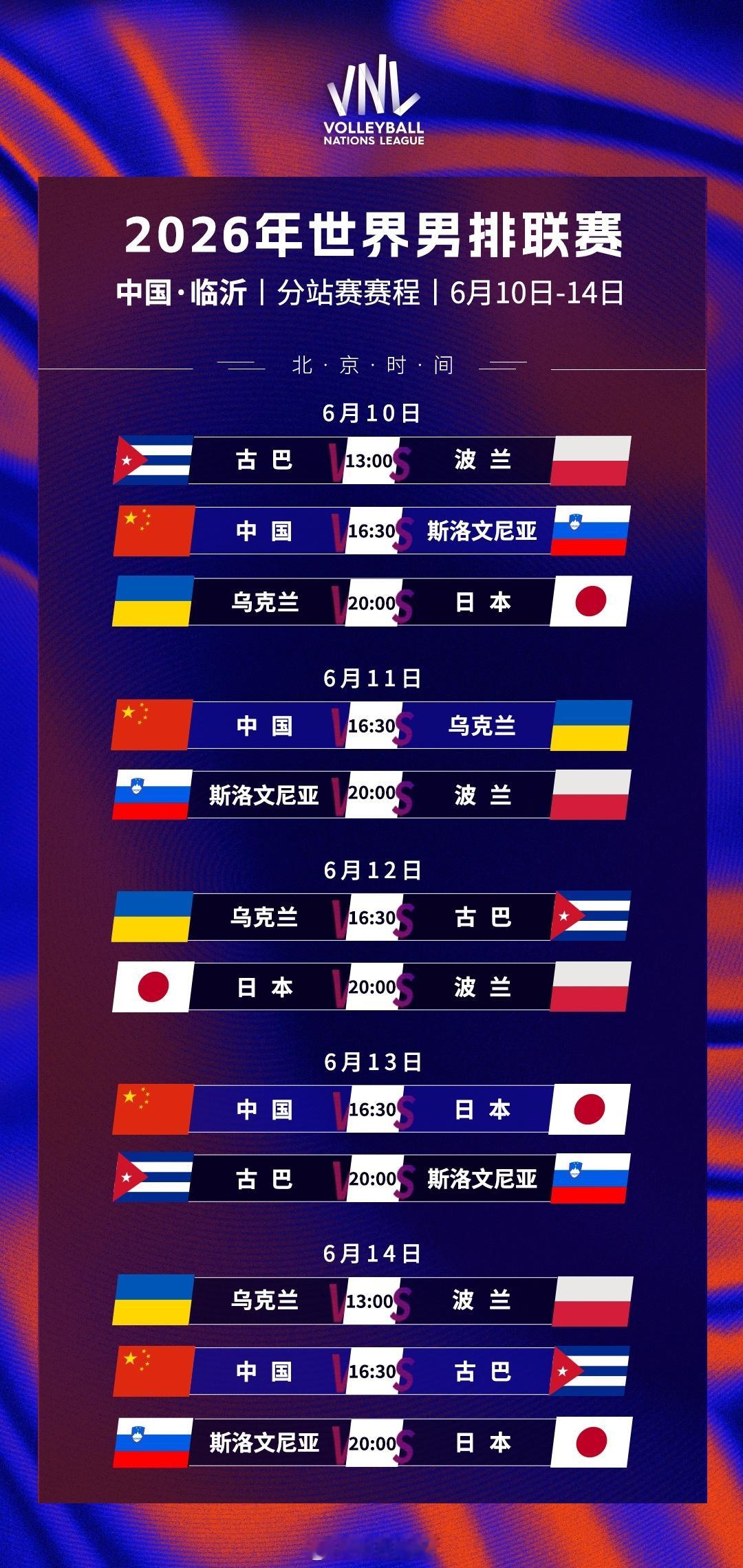 收藏转发!中国男排2026世界男排联赛 分站赛竞赛日程(北京时间):