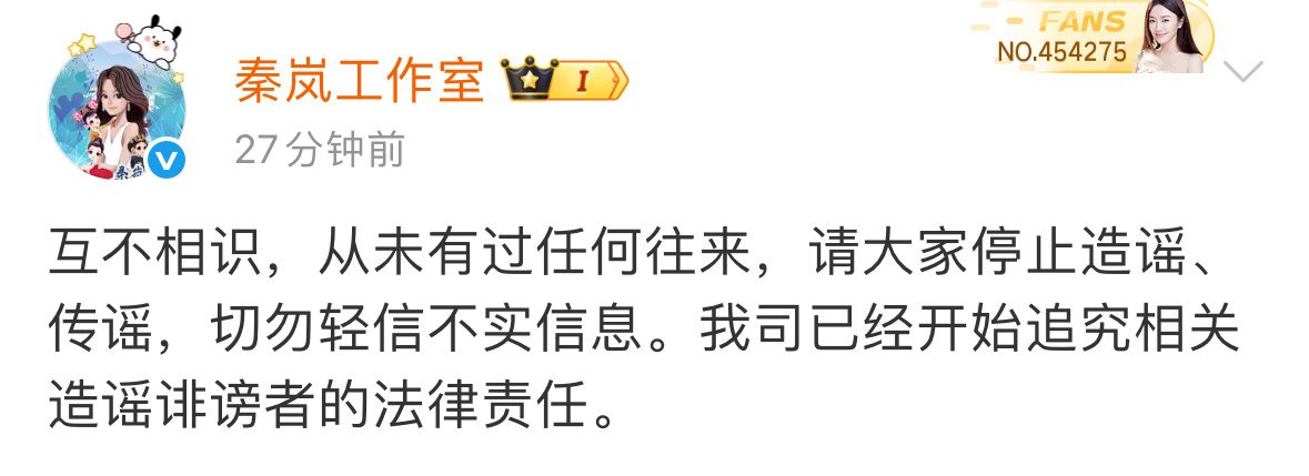 秦岚工作室声明 秦岚工作室发声明辟谣和金子涵相关“互不相识,从未有过任何往来”