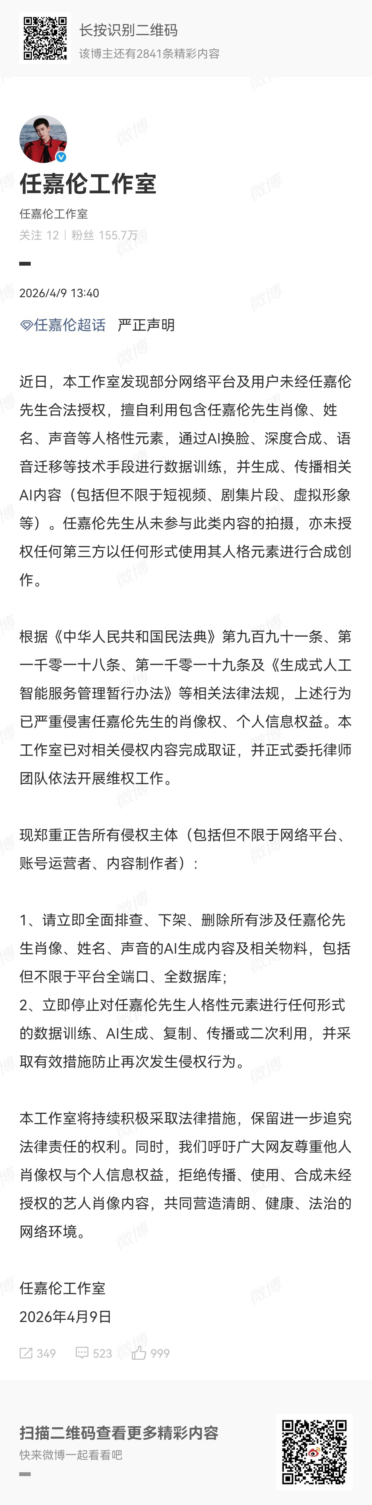 任嘉伦方抵制AI侵权声明任嘉伦工作室AI维权任嘉伦工作室发布抵制AI侵权声明,依