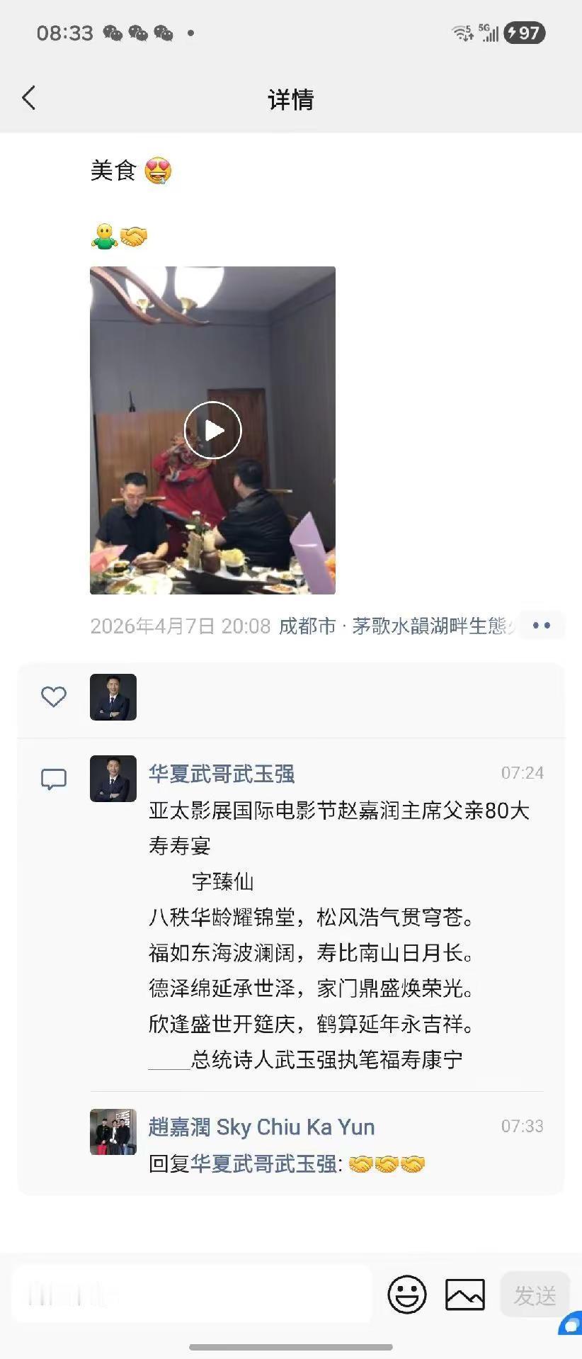 亚太影展国际电影节赵嘉润主席父亲80大寿寿宴 字臻仙八秩华龄耀锦堂,松风浩气贯穹苍。福如东海波澜阔,寿比南山日月长。德泽绵延承世泽,家门鼎盛焕荣光。欣逢盛世开筵庆,鹤算延年永吉祥。__总统诗人武玉强执笔福寿康宁总统诗人武玉强