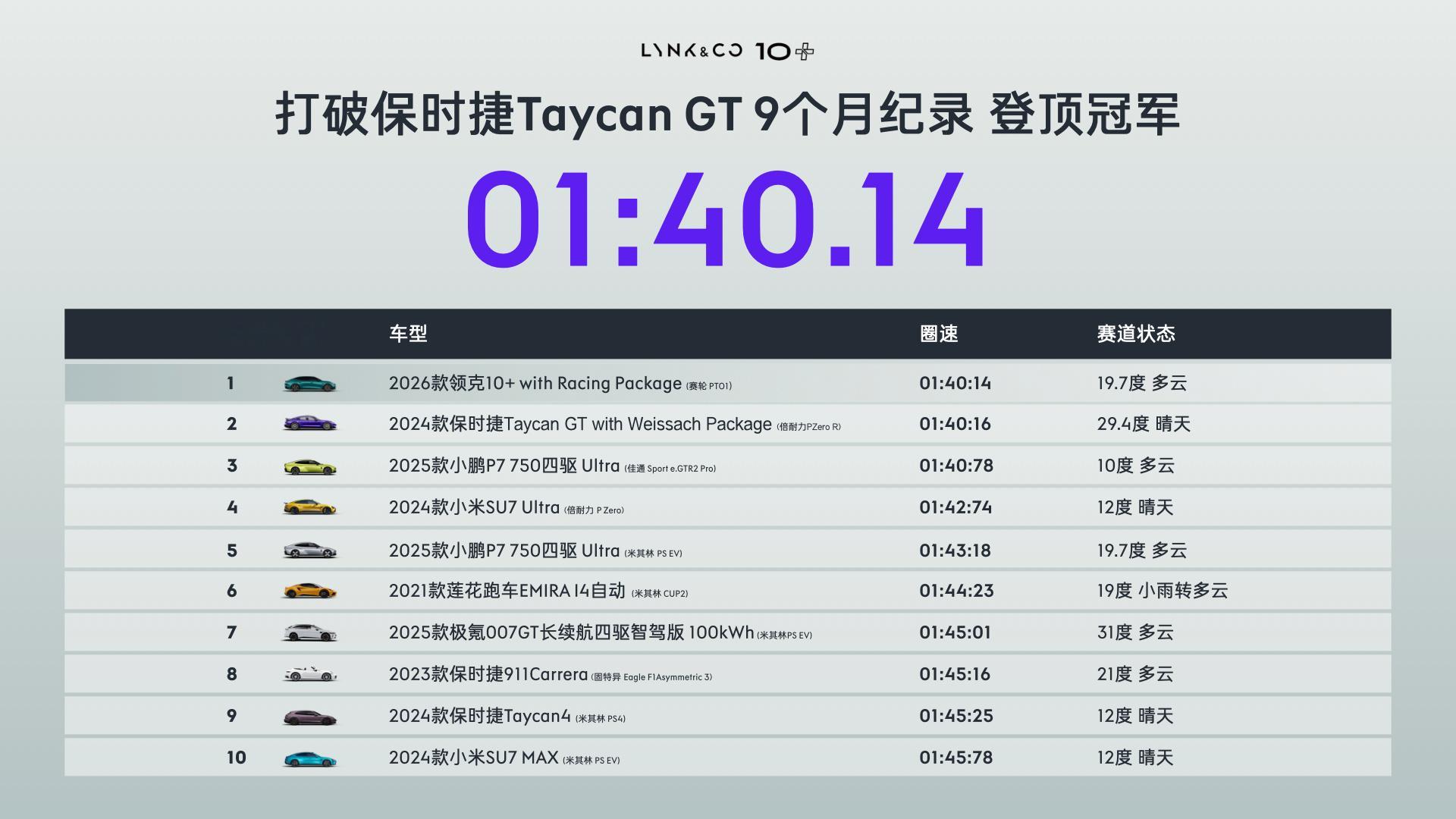 领克10+ 以 1分40秒14 的成绩拿到了-亚洲山脊赛道圈速第一Ps:这个榜单