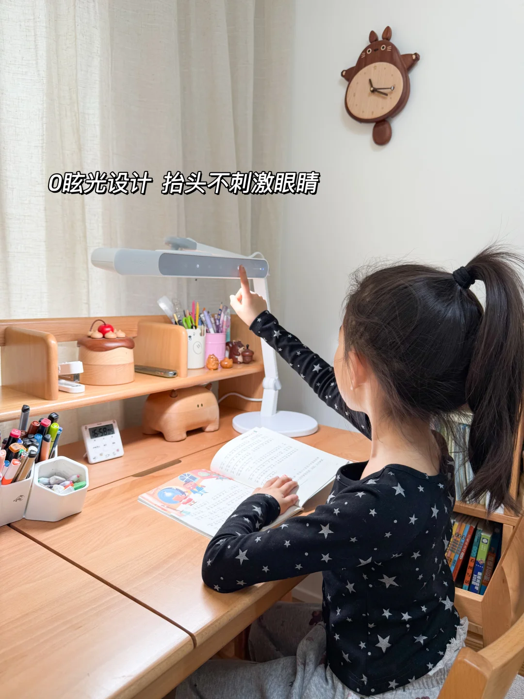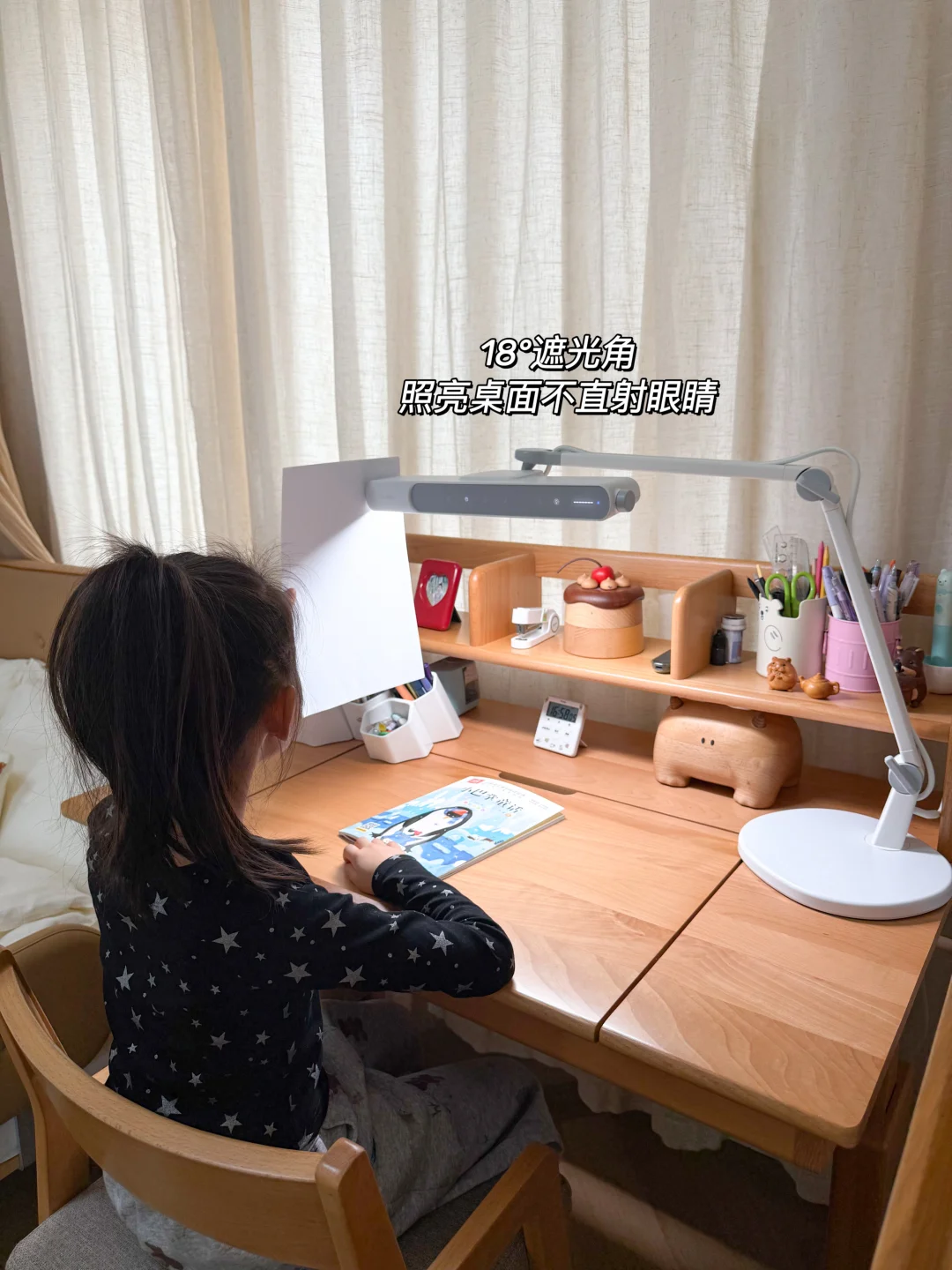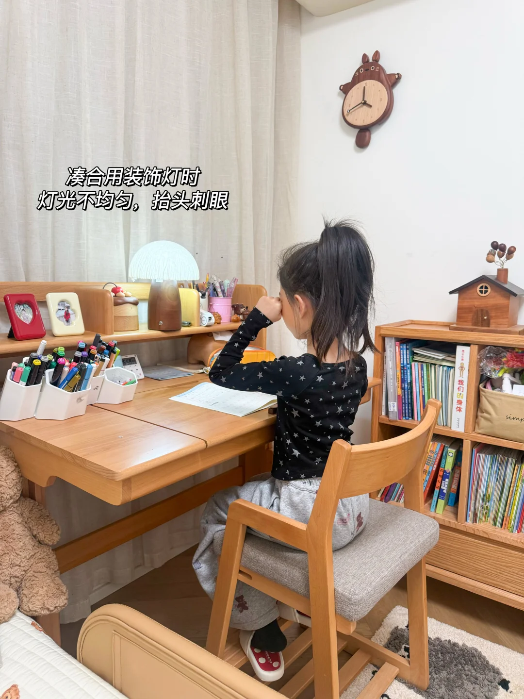 孩子上小学后,每天放学都要写作业、读课外书,最近发现她小毛病越来越多。写作业特别磨蹭,专注力还差,经常写不了半小时就频繁揉眼、皱眉眯眼。我特意弯下腰从孩子的角度仔细看才发现,问题出在灯光上!之前房间用的学习台灯是我觉得造型好看买的,光线不够均匀,作业本上都是暗角和手影,而且灯泡是裸露在外的,一抬头特别刺眼,孩子看久了眼睛肯定累!