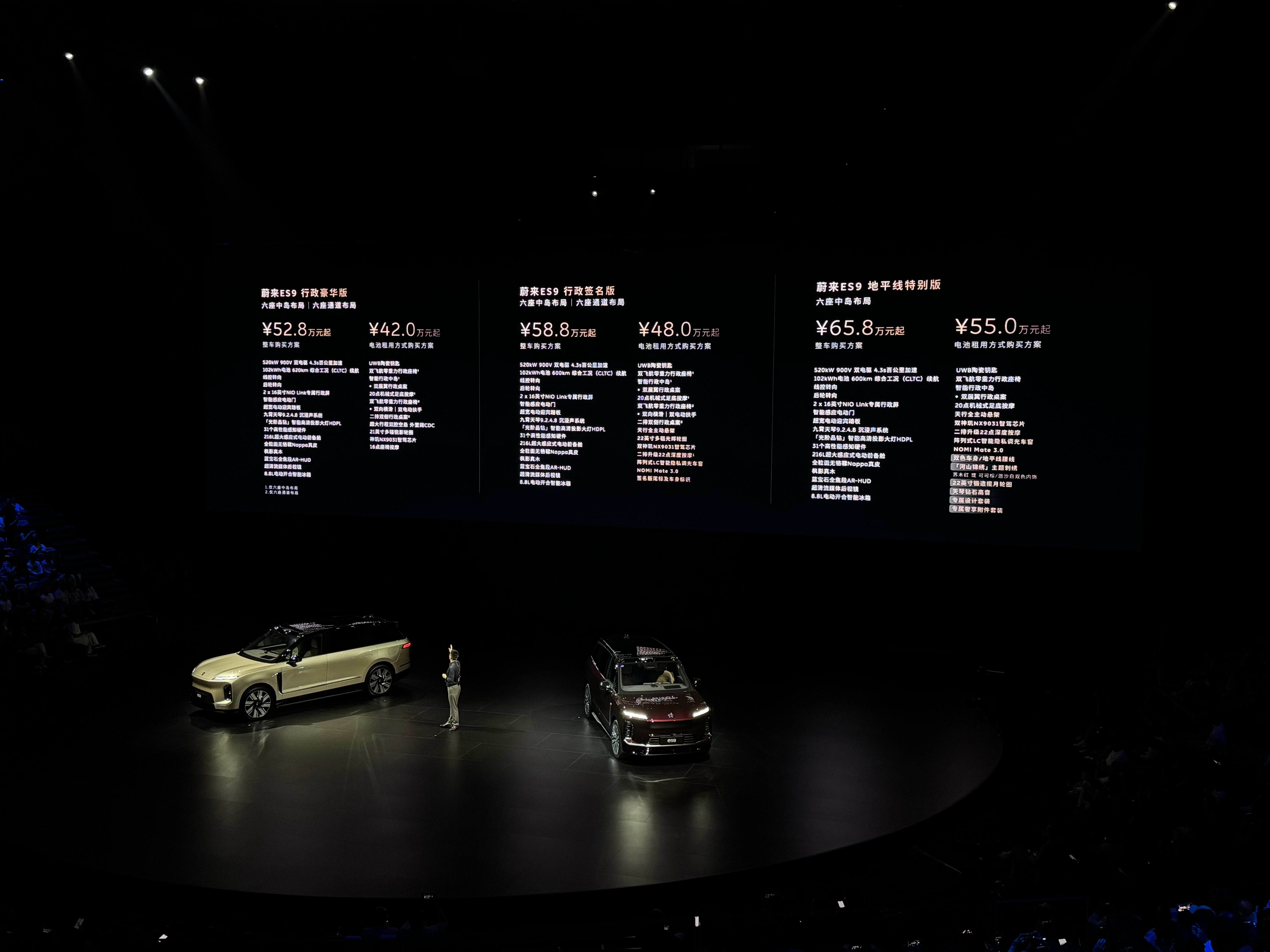 蔚来ES9产品技术发布会刚从现场第一时间发来快报🔥蔚来ES9预售正式开启整车预售价52.8万起,电池租用42万起5000元预订金抵10000元购车款老车主专属复购权益同步上线展车已到店,5月中旬开启试驾5月底上市交付,中岛/通道座椅分批交付