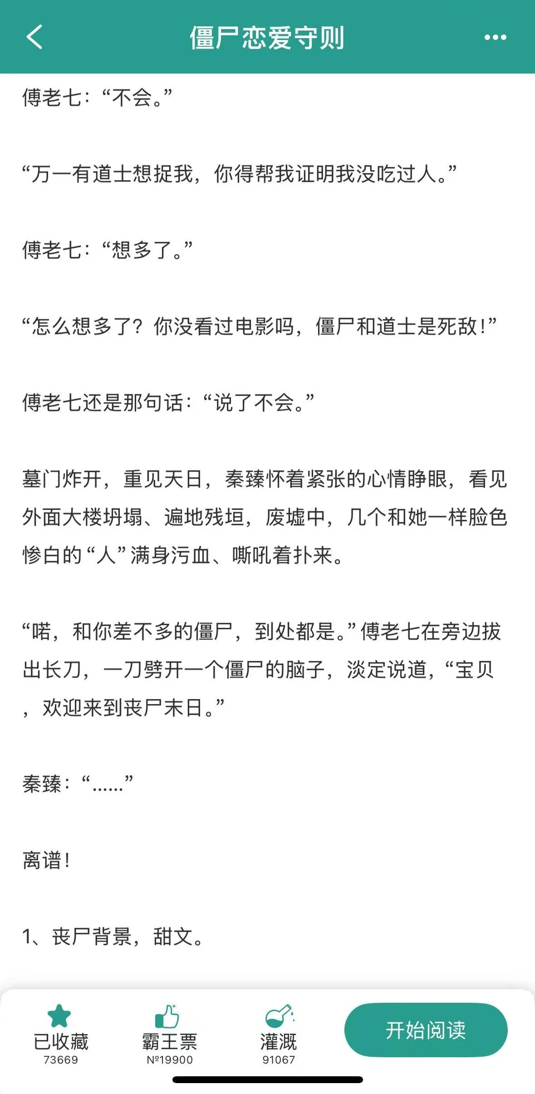 [黄金薯R]故事设定也很新颖,呆萌中二又迷信的小僵尸,跟毒舌腹黑但又很深情的末世精英,一僵一人,一路上吵吵闹闹的升级打怪。