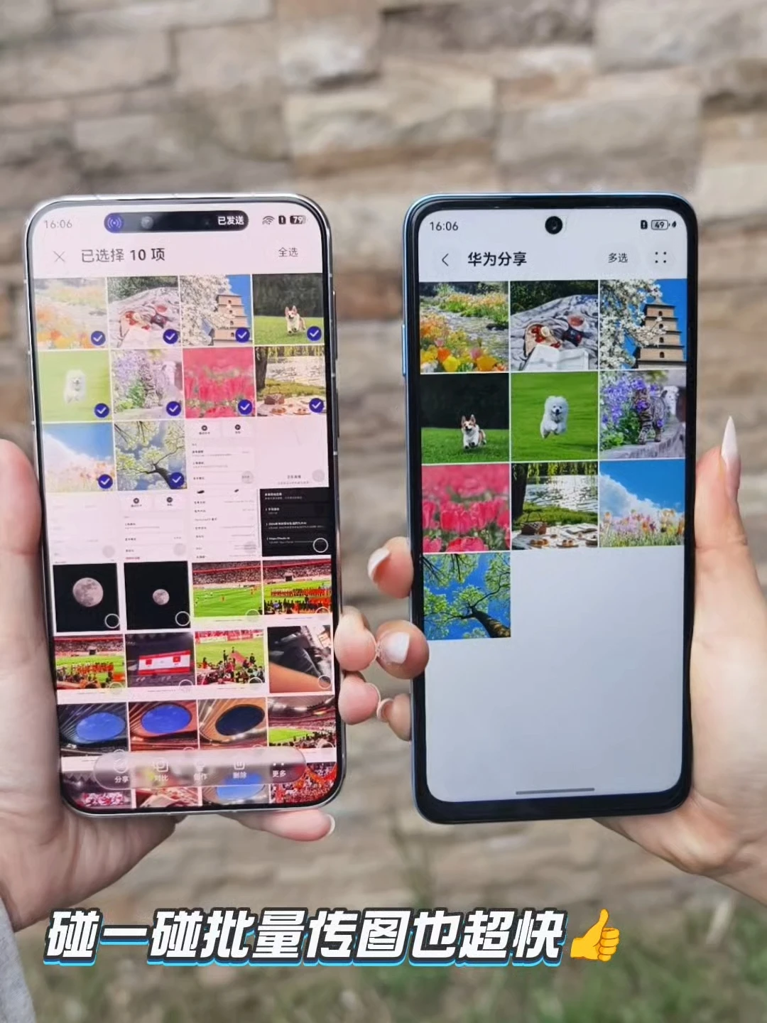 她选完照片正准备打开华为分享,我直接凑上去跟她碰了碰手机,顺便往上一划拉,十来张照片嗖地过去来了,速度超快还不用流量~👏