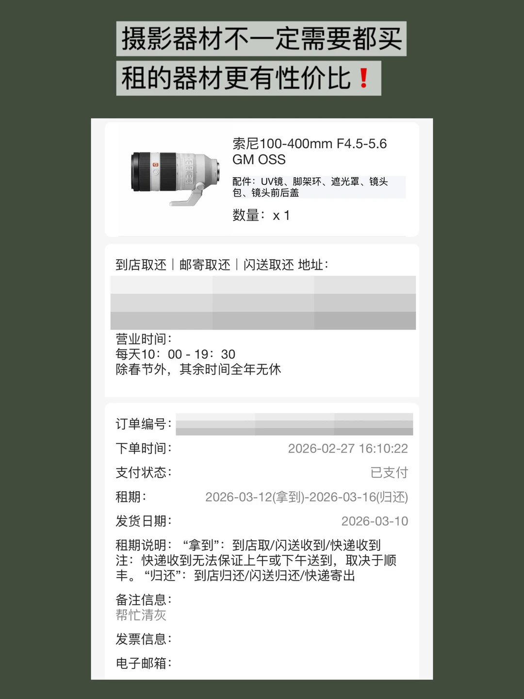 飞哥常用镜头没有这个,是在老朋友星空租赁租的,4.12-4.15租了3天,ZFB小🍊序搜星空相机租赁,有活动很划算的。出发日前一天送到,回来次日再寄出去就可以。上海飞友可以选自取,外地飞友邮寄咯