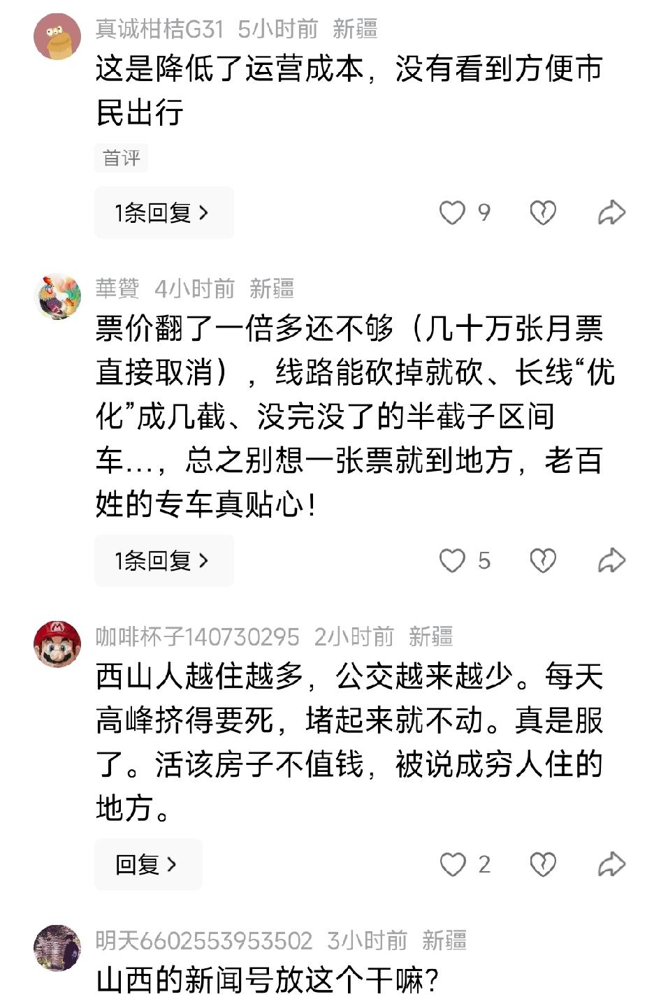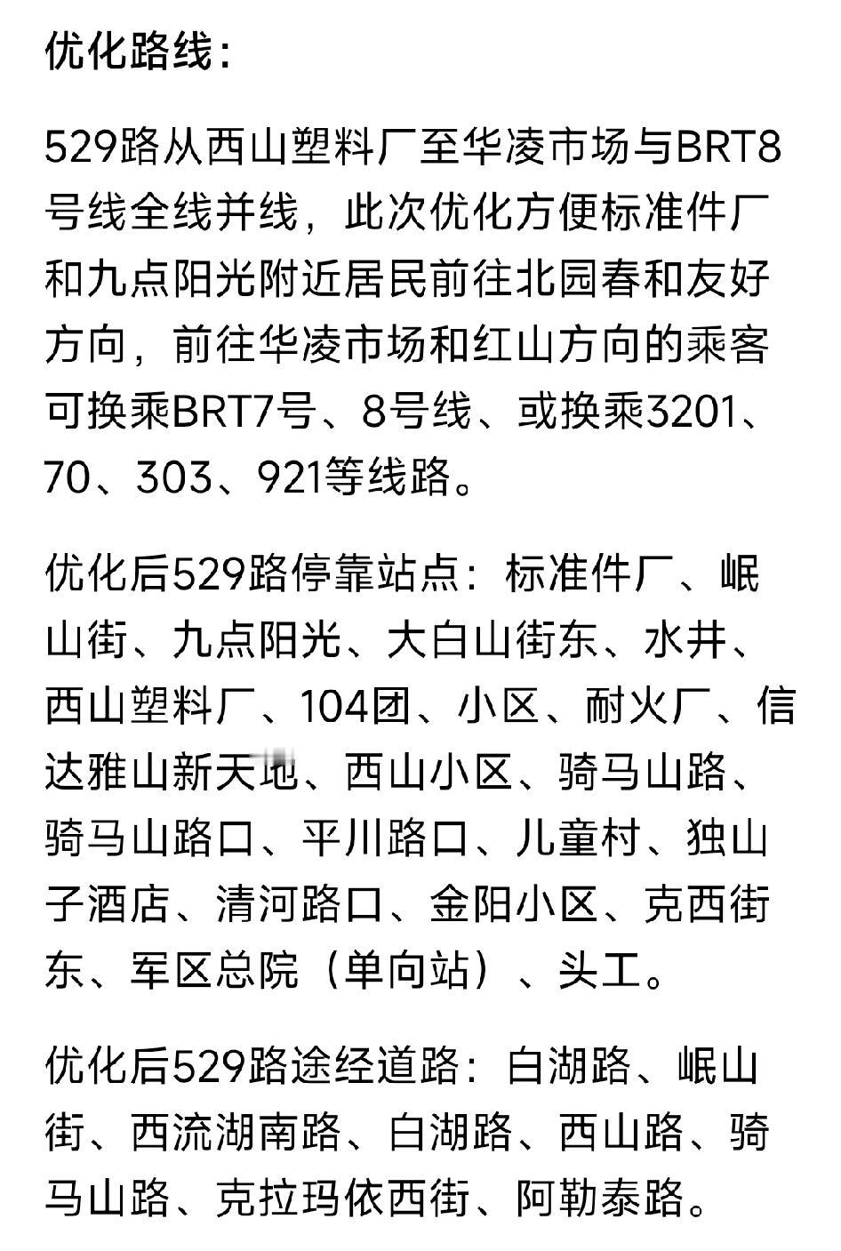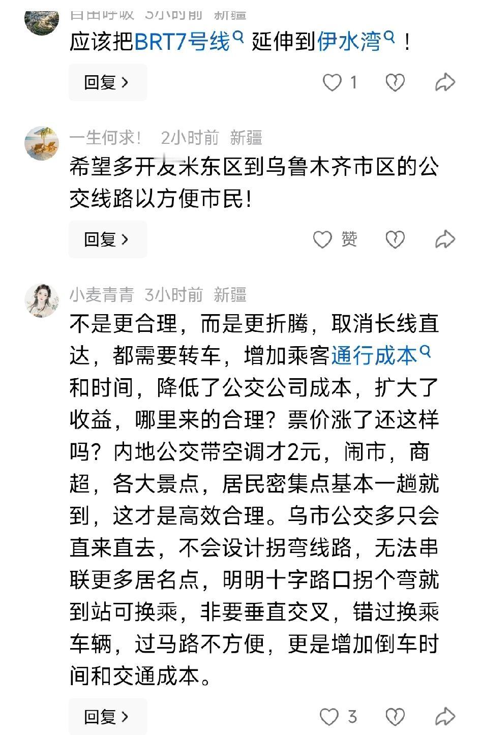 这样优化公交线路合情合理。529线路公交车客流量少。每趟车乘客上座率空荡荡的。而有网友发文说,不是更合理,而是更折腾,取消长线直达,都需要转车,增加乘客通行成本和时间,降低了公交公司成本,扩大了收益,哪里来的合理?票价涨了还这样吗?内地公交带空调才2元,闹市,商超,各大景点,居民密集点基本一趟就到,这才是高效合理。乌市公交多只会直来直去,不会设计拐弯线路,无法串联更多居名点,明明十字路口拐个弯就到站可换乘,非要垂直交叉,错过换乘车辆,过马路不方便,更是增加倒车时间和交通成本。票价翻了一倍多还不够(几十万张月票直接取消),线路能砍掉就砍、长线“优化”成几截、没完没了的半截子区间车,总之别想一张票就到地方,老百姓的专车真贴心!西山人越住越多,公交越来越少。每天高峰挤得要死,堵起来就不动。真是服了。活该房子不值钱,被说成穷人住的地方。新疆公交车站 公交运行方案 乌市公交集团 新疆公交站台 取消公交
