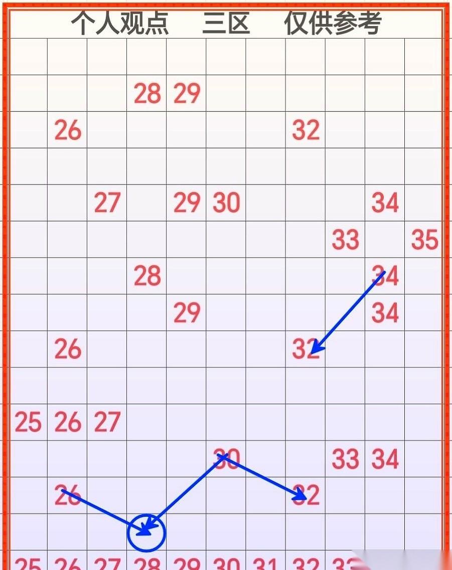最关键的是三区。他眯着眼,手里的红笔悬在半空,笔尖在26和28之间来回晃动,最后重重地圈住了30到32那块地方,那动作,仿佛不是在选号,是在圈地。