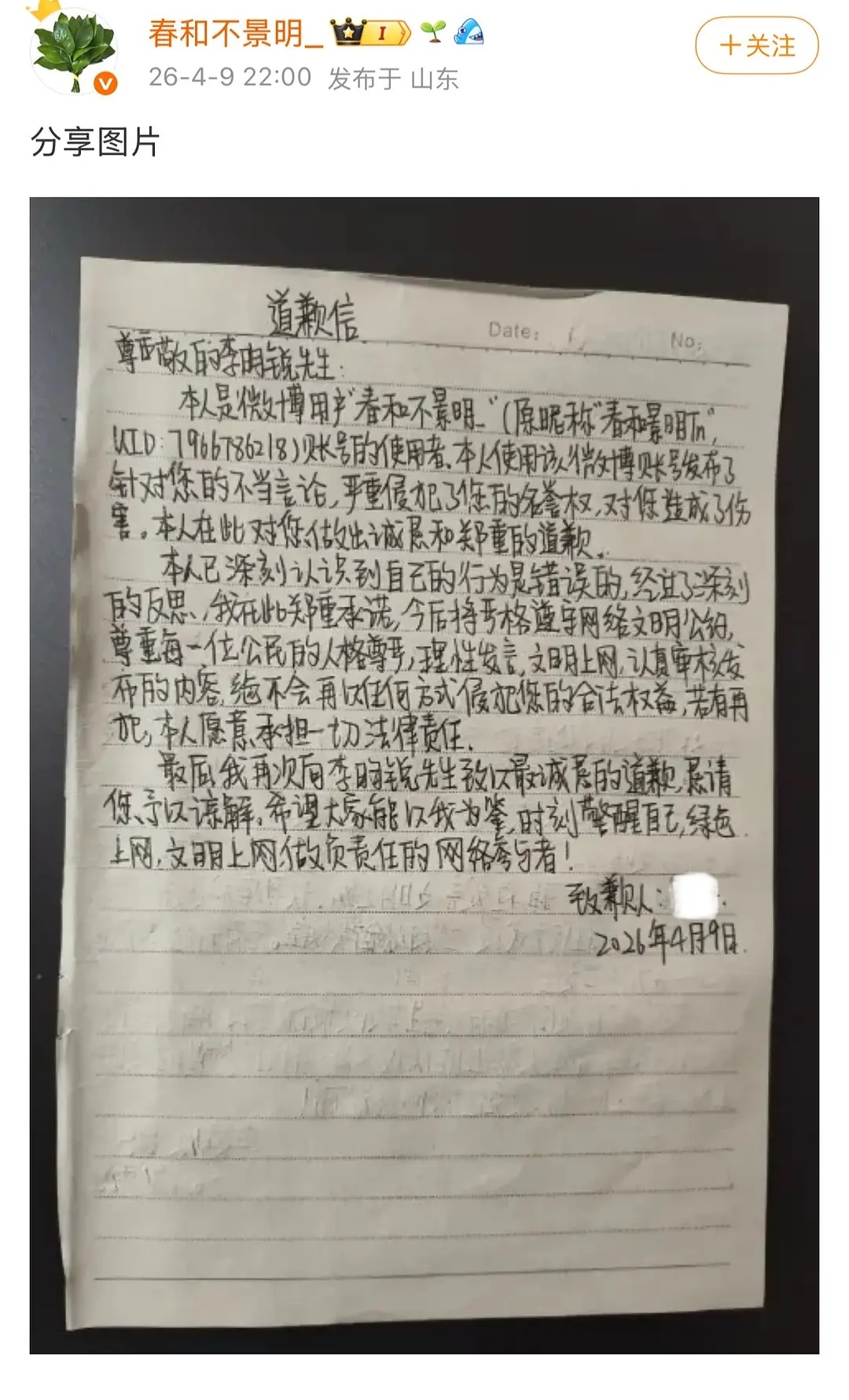 李昀锐告黑成功!!收获嘿粉手写道歉信一封!