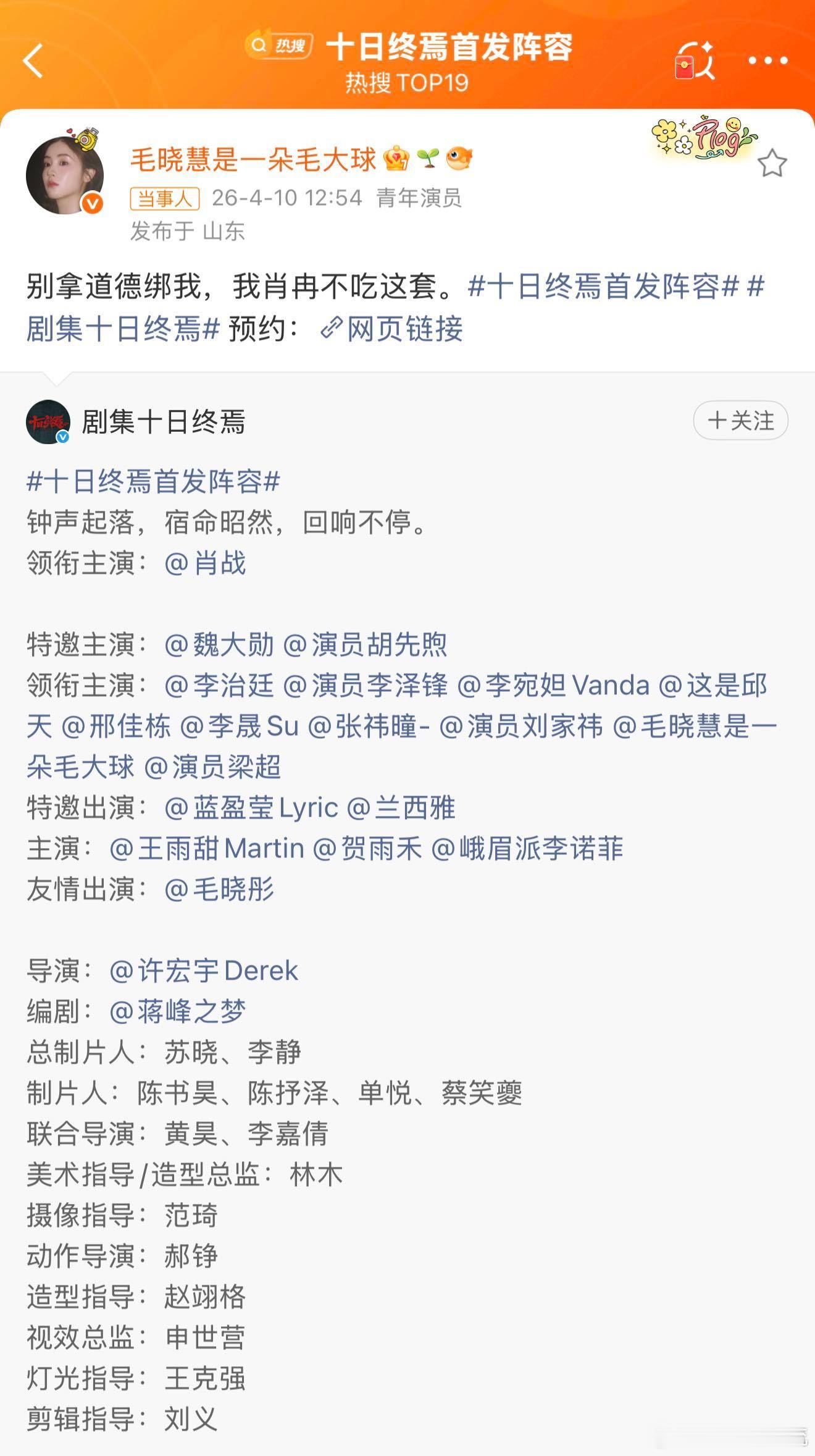 毛晓慧回应十日终焉演肖冉 真正的内娱勇士来了,毛晓慧官宣出演十日终焉肖冉,胆子够大,勇气可嘉,把握住机会给自己一个新的代表作品,这也是一个会选剧本的表现,毕竟肖冉这个角色,另一个角度来看也是自带讨论度最高的角色 毛晓慧领衔主演十日终焉