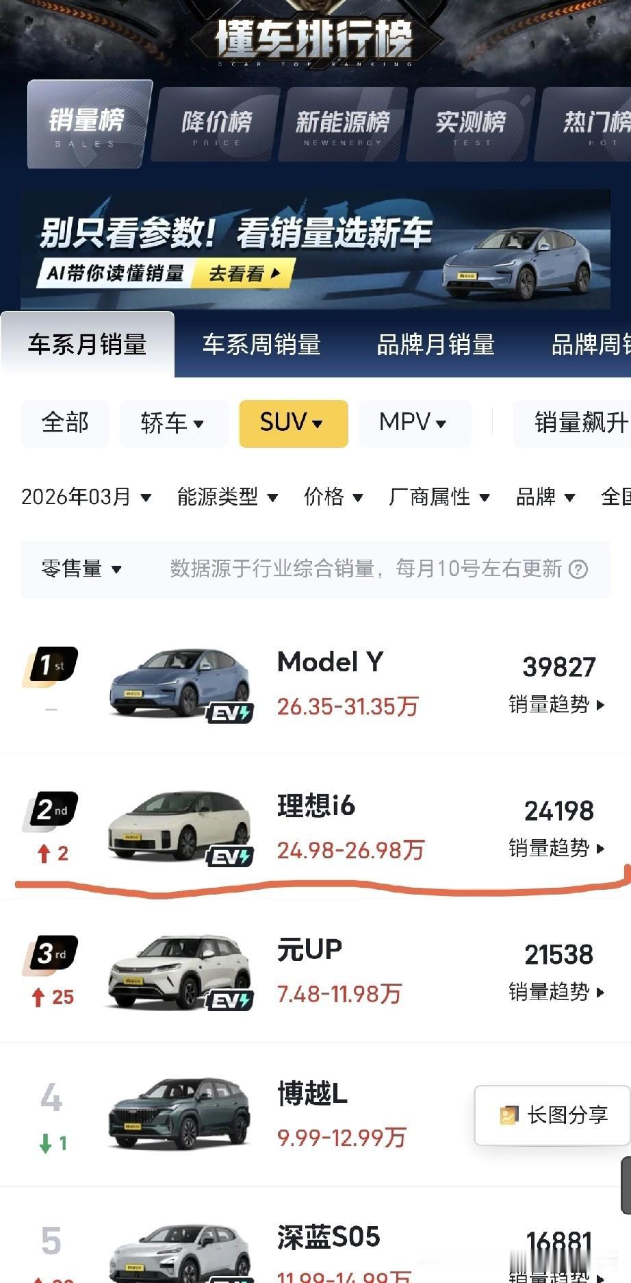 理想i6,是理想汽车新形态五座SUV,全系标配新一代5C磷酸铁锂电池,充电10分钟续航500公里。全新设计、全新形态,运动感与大空间兼得,是去年9月份上市,累计销量超8万台,今年3月销量24198辆!在外观设计上,喜欢的人是非常喜欢!