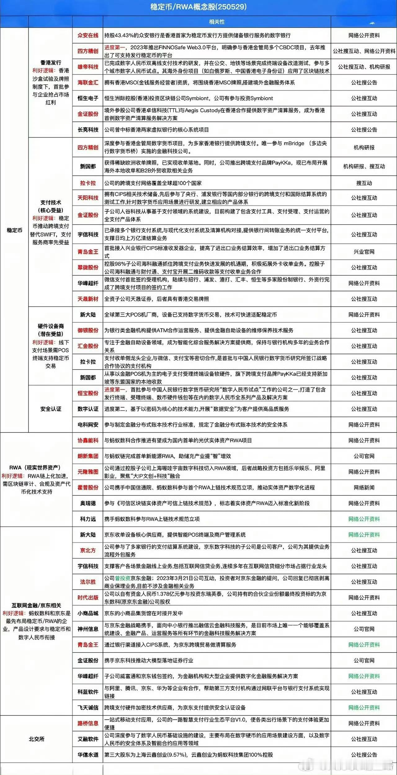 互联网/电商巨头:京东(币链科技)已进入沙盒测试,计划发行港元稳定币 JD-HKD;蚂蚁集团(蚂蚁数科)及 腾讯(旗下金融机构)也均在申请序列中 。