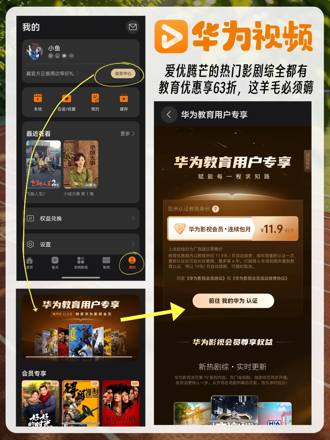 [蓝色心形R]华为视频:HarmonyOS 5.0以下用户点“个人中心>其他>教育优惠”; HarmonyOS 5.0及以上用户点“我的>会员中心>banner”