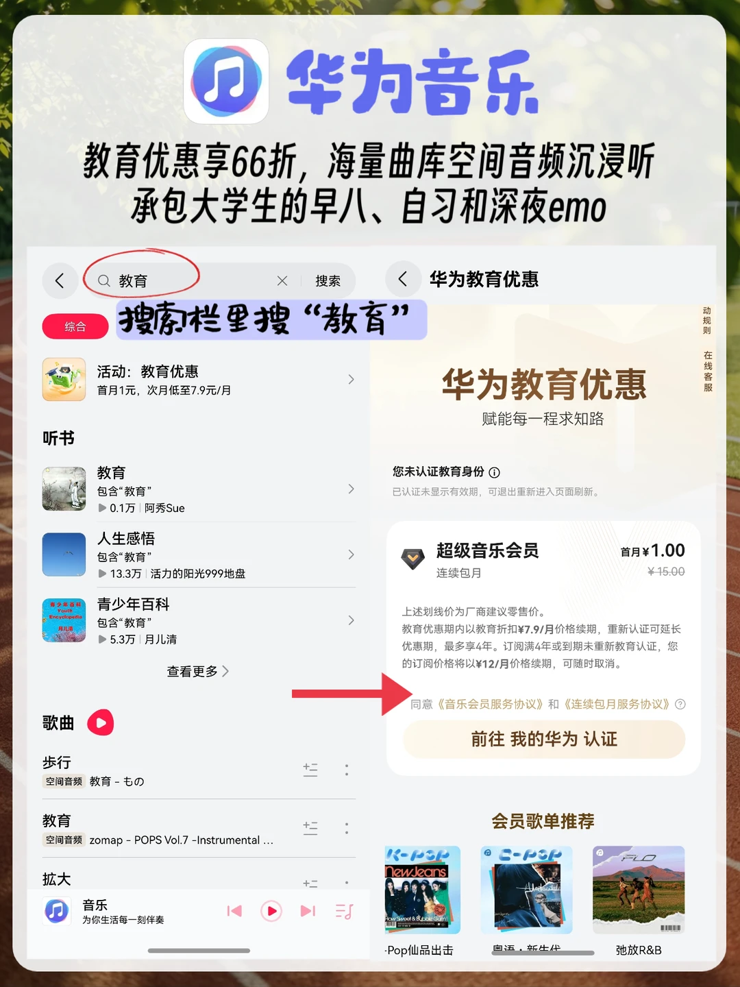 [蓝色心形R]华为音乐:搜索直达区搜“教育”