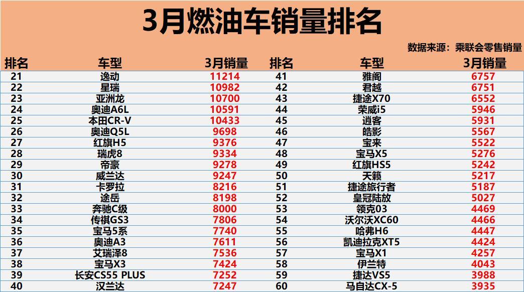 燃油车销量排行榜出来了,3月日产轩逸卖了2.8万辆,位居燃油车销量第一,也能进入所有车型销量前十名。
