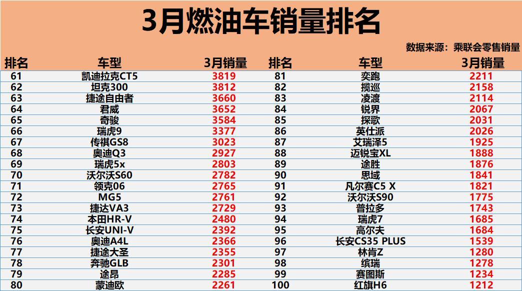 第100名是红旗H6,销量是1212辆。除此之外,3月不少燃油车销量只有个位数,比如曾经的爆款车型起亚K5,3月只卖了9辆。