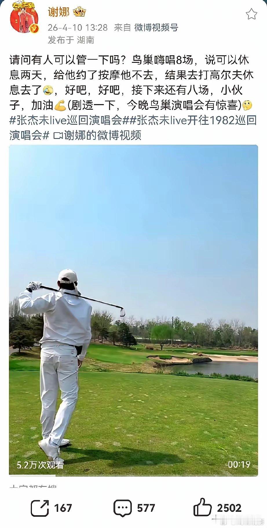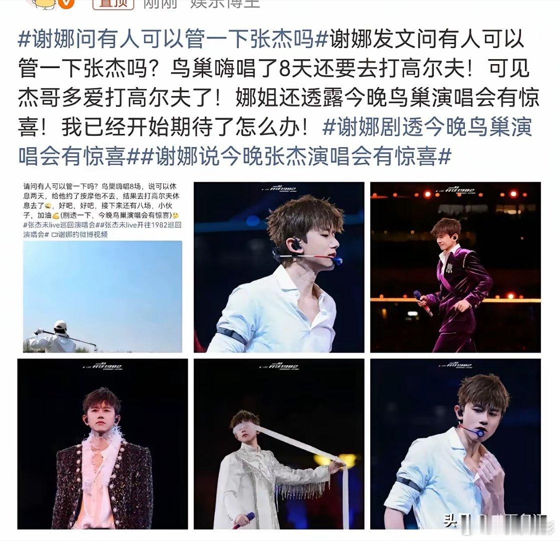 谢娜,忍不了了!4月10日,谢娜突然高调发文,仅仅10个字,没想到居然罕见地吐槽起了张杰,字里行间又透露出抑制不住的骄傲和宠溺:“有人可以管一下张杰吗?”,夫妻间的甜蜜默契一眼就能看穿。张杰在北京鸟巢连续开唱8天,全程全开麦演绎多首经典曲目,高强度唱跳舞台丝毫没有拉低演唱水准,每一首歌都唱得深情又饱满。谢娜心疼老公连轴演出太过疲惫,特意贴心安排了按摩放松,想让他好好休整,可张杰依旧闲不住,刚结束舞台表演就跑去打高尔夫,活力满满。嘴上吐槽他停不下来,心里却满是自豪。张杰对音乐始终抱着极致的认真,每一首作品都精心打磨,每一场舞台都全力以赴,用扎实的唱功和赤诚的热爱,带给观众最极致的现场体验。这份对舞台的执着,正是谢娜打心底里为他骄傲的原因,她还顺势剧透当晚演唱会有惊喜,期待之情溢于言表。看似嗔怪的话语,全是温柔的宠溺与支持。最好的爱情莫过于此,你全力以赴追逐热爱,我默默守护心疼你的疲惫,更因你的每一份耀眼,满心欢喜与自豪。