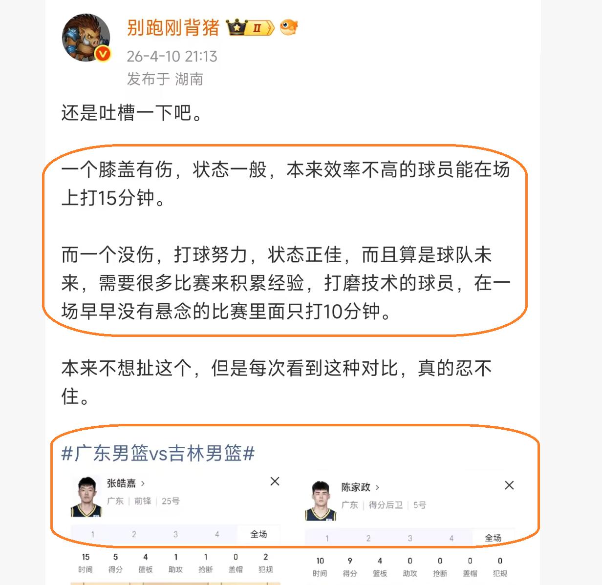 然而,杜锋的这番话,却遭到了CBA记者“别跑刚背猪”的质疑,他认为杜锋在用人方面,有大问题,受伤的球员,打得一般,效率不高的张皓嘉,在场上打了15分钟。反观,没有伤病,而且,打球十分努力,状态也是十分不错的陈家政,却只打了10分钟,这样的情况,明显是存在问题。