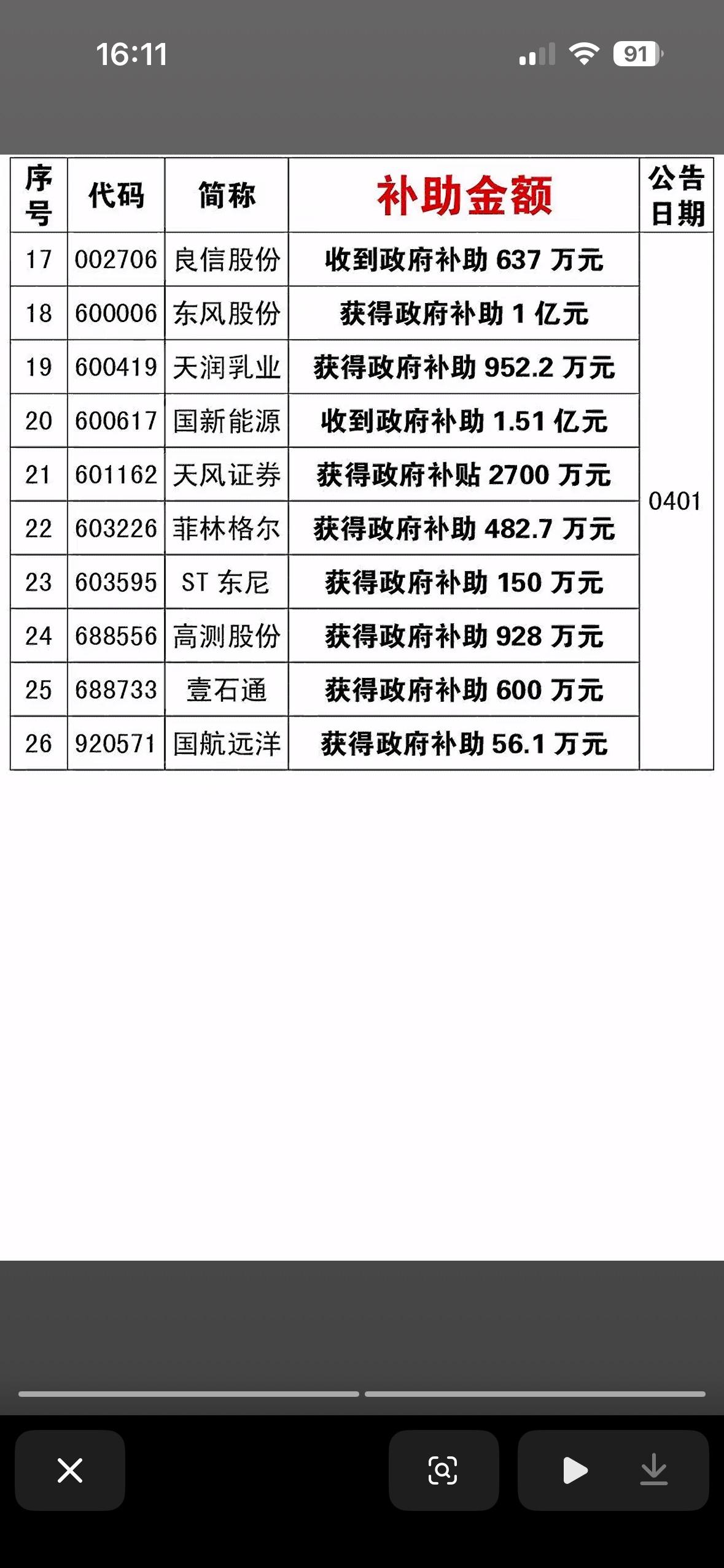 近期(4月1日~4月11日)获得政府补助的上市公司汇总,通常这类信息被市场视为一种“利好”,因为它直接增加了公司的当期利润或现金流,同时也代表了国家政策对该行业的支持方向。
