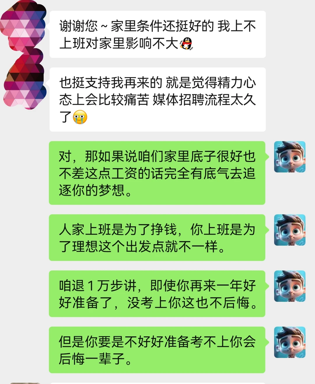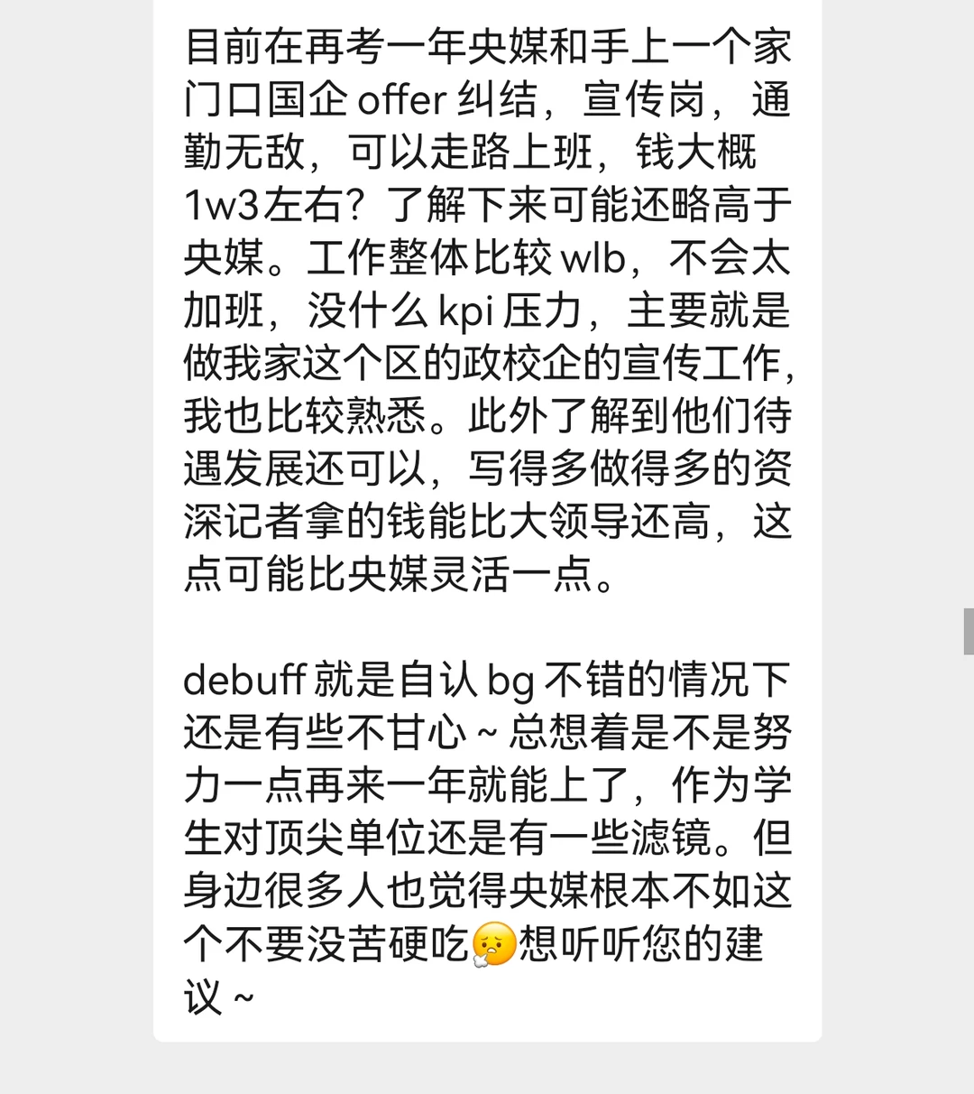 接粉丝投稿:QS10硕士,京户,家庭条件不错,目前拿到了家门口国企宣传岗,1.3w,有不错的发展前景,但是自己是传媒专业出身,学历背景也不错,因为没有好好准备央媒校招,全部下岸有些可惜,现在纠结要不要再来一年。