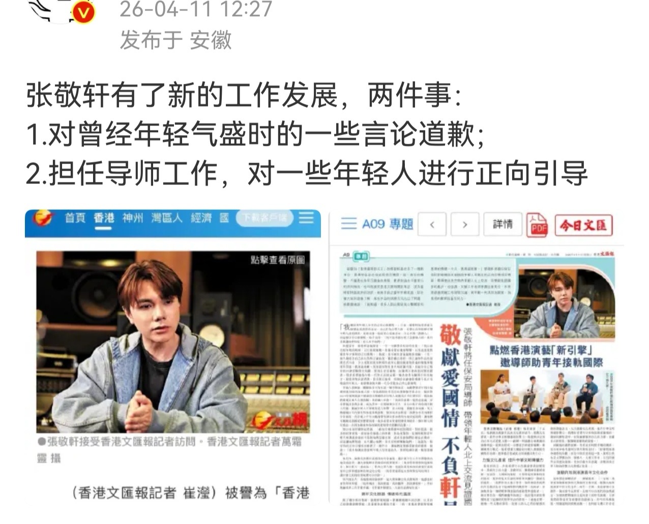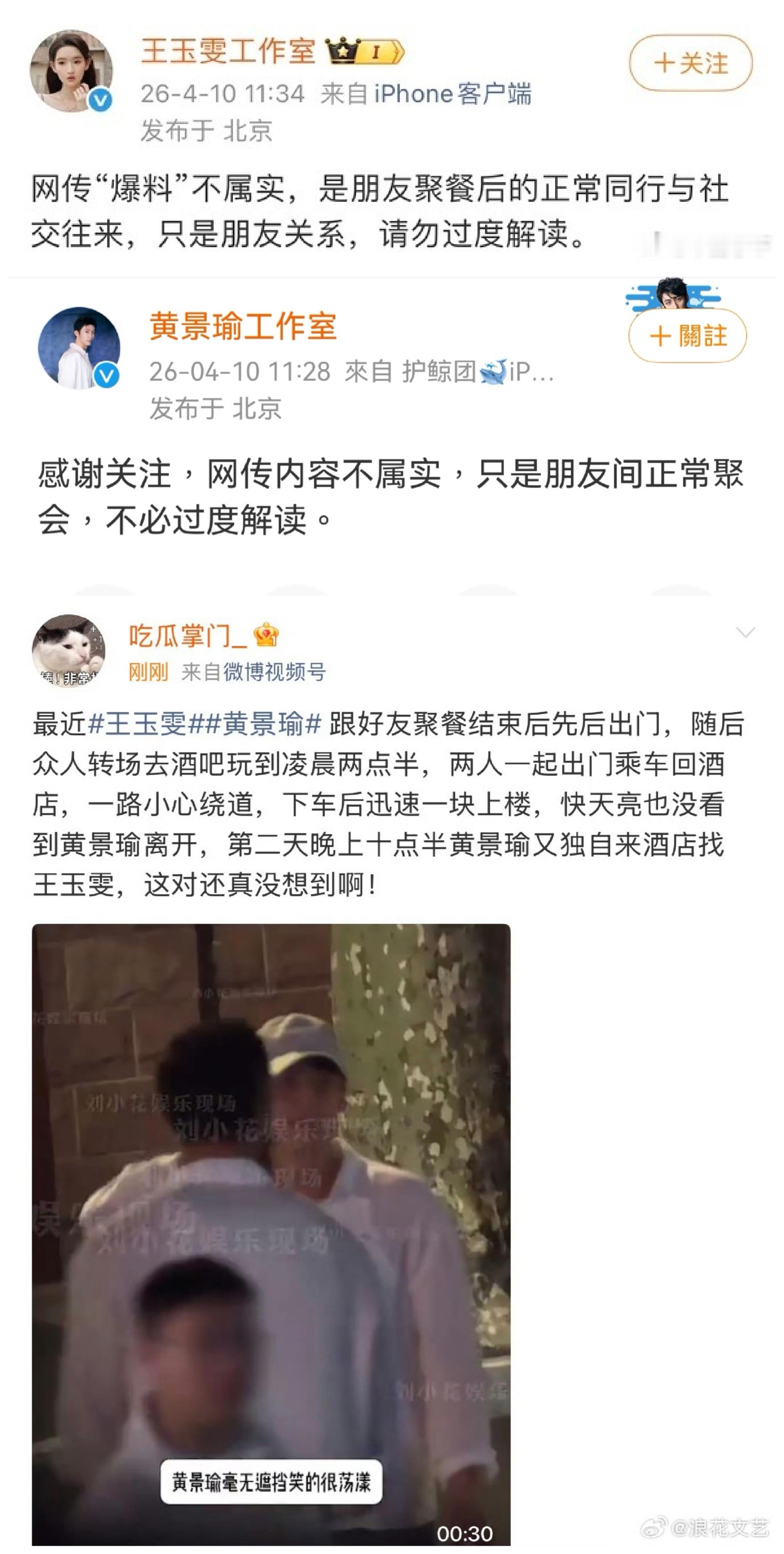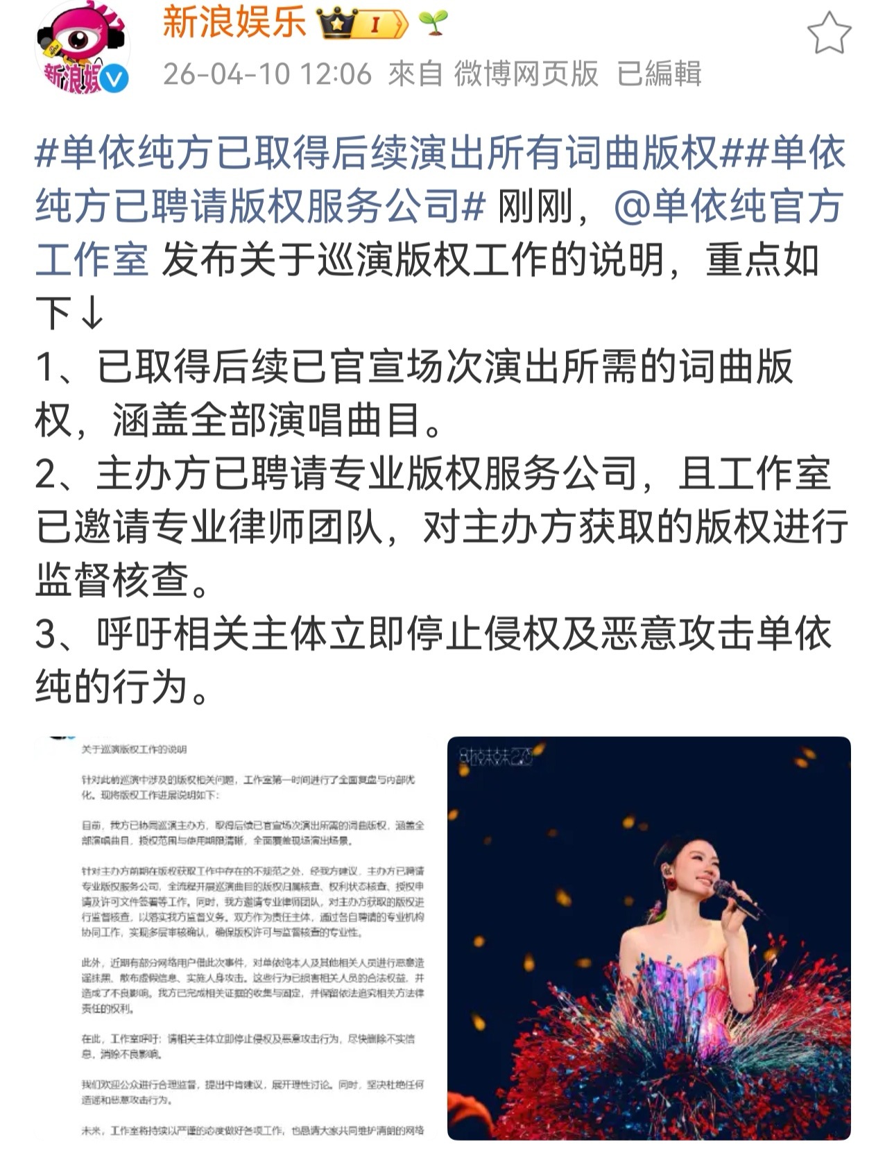 2026-04-11总结①黄景瑜,王玉雯辟谣绯闻 图1②单依纯工作室于声明,确认已协同巡演主办方取得后续所有官宣场次演出的完整词曲版权授权,覆盖全部演唱曲目,并建立双重专业审核机制保障版权合规 图2③杨洋红v努力 图3④周杰伦工作室否认演唱会划水 图4⑤赵子琪在《乘风2026》一公淘汰后发文明确表态"不会再来浪姐",并提及节目组处理方式令其感受到"被侮辱" 图5⑥陈昊宇点赞了吐槽粉丝管太多的博文 图6⑦浪姐《咏春》舞台编舞被指抄袭民族舞剧《红楼梦》 图7⑧张敬轩为钱低头,道歉,表态爱国,要来内地奋斗 图8⑨周渝民妻子喻虹渊复出 图9⑩十日终焉开机 图10