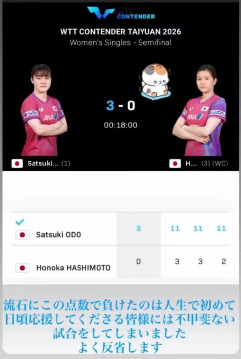 4月11日太原挑战女单半决赛日本队员内战,大藤沙月3一0桥本帆乃香,11一3,11一3,11一2用时20多分钟,桥本帆乃香是去年的冠军,今年立志要卫冕成功,做梦也没想到输成这样,赛后随即就发文说,第一次这么悬殊的比赛落败。