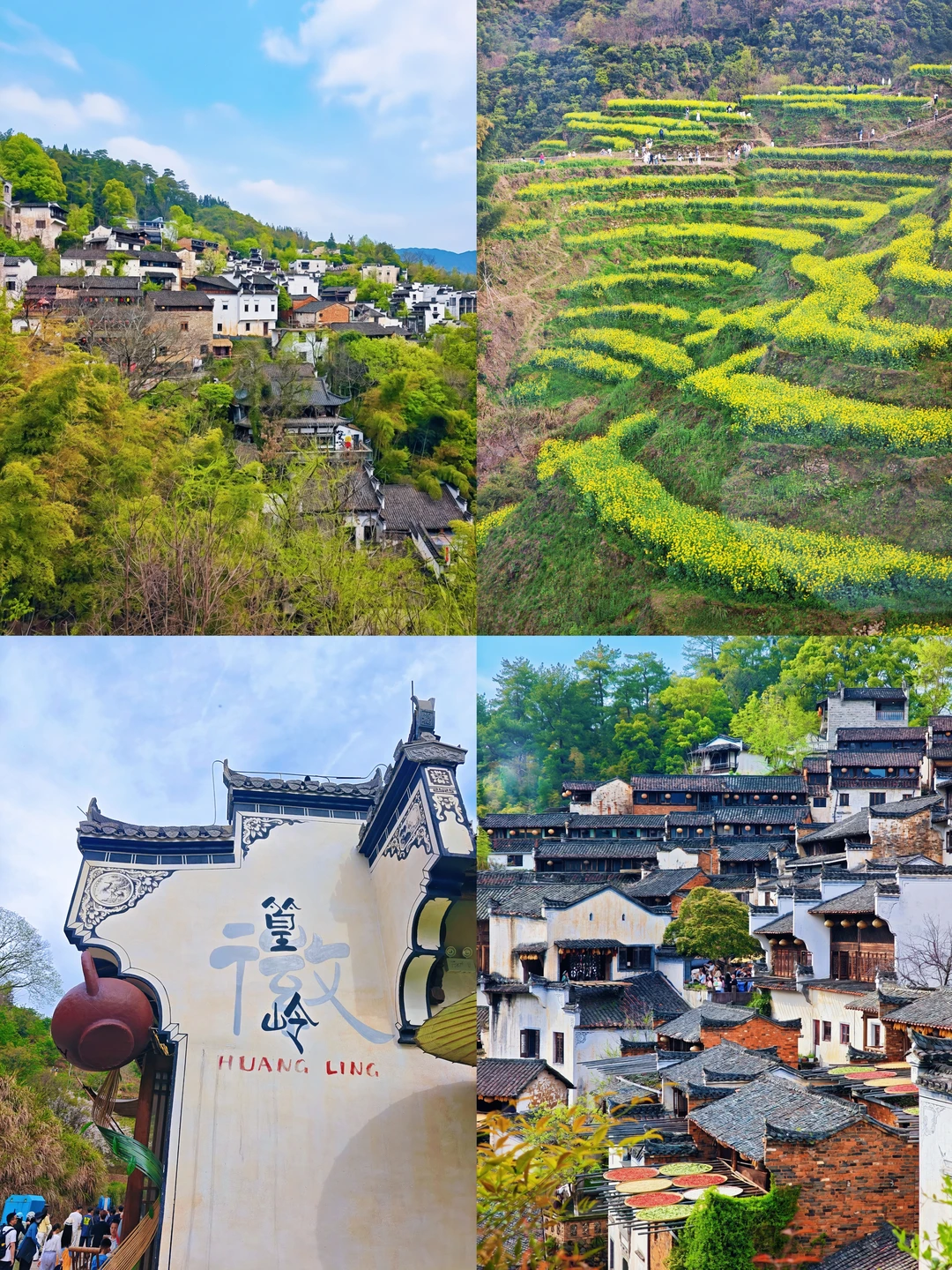 下午直奔篁岭,按照A线上B线下的路线游玩,全程不走回头路,省力又能逛全核心景点。篁岭的徽派古村依山而建,天街古巷串联起各式古建,前店后坊的格局像一幅流动的古村画卷。清明时节,梯田花海正值盛期,层层叠叠的金黄花海环绕着粉墙黛瓦,视觉效果绝佳。花溪水街、悬浮屋、垒心栈桥都是必打卡点,高空玻璃栈道惊险又能俯瞰全景,全程游玩下来,既能感受古村韵味,又能饱览春日自然风光