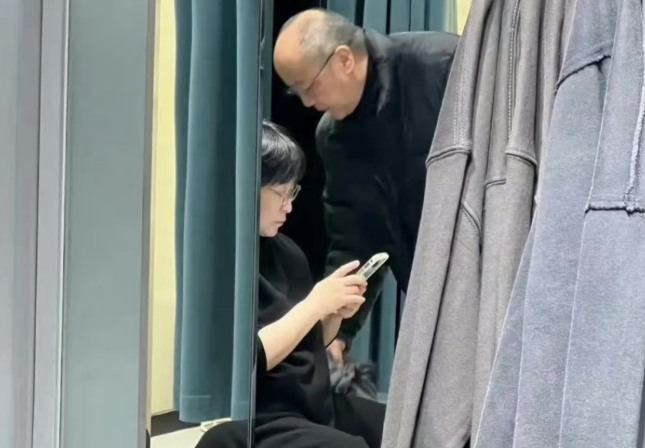 同行的女子打扮素雅,安静坐在试衣间外等候,全程自然从容,没有刻意迎合,两人互动透着一种平淡又舒服的默契,被目击者调侃是“老夫老妻”般的松弛感。