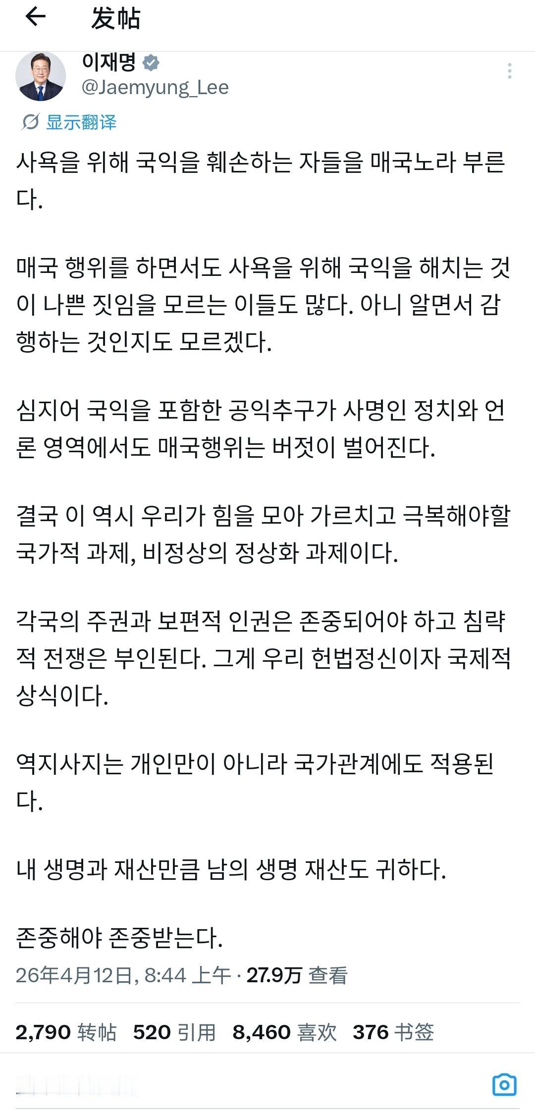 李在明,明文把那些「为了私欲损害国家利益」的人,直接定性为卖国贼。