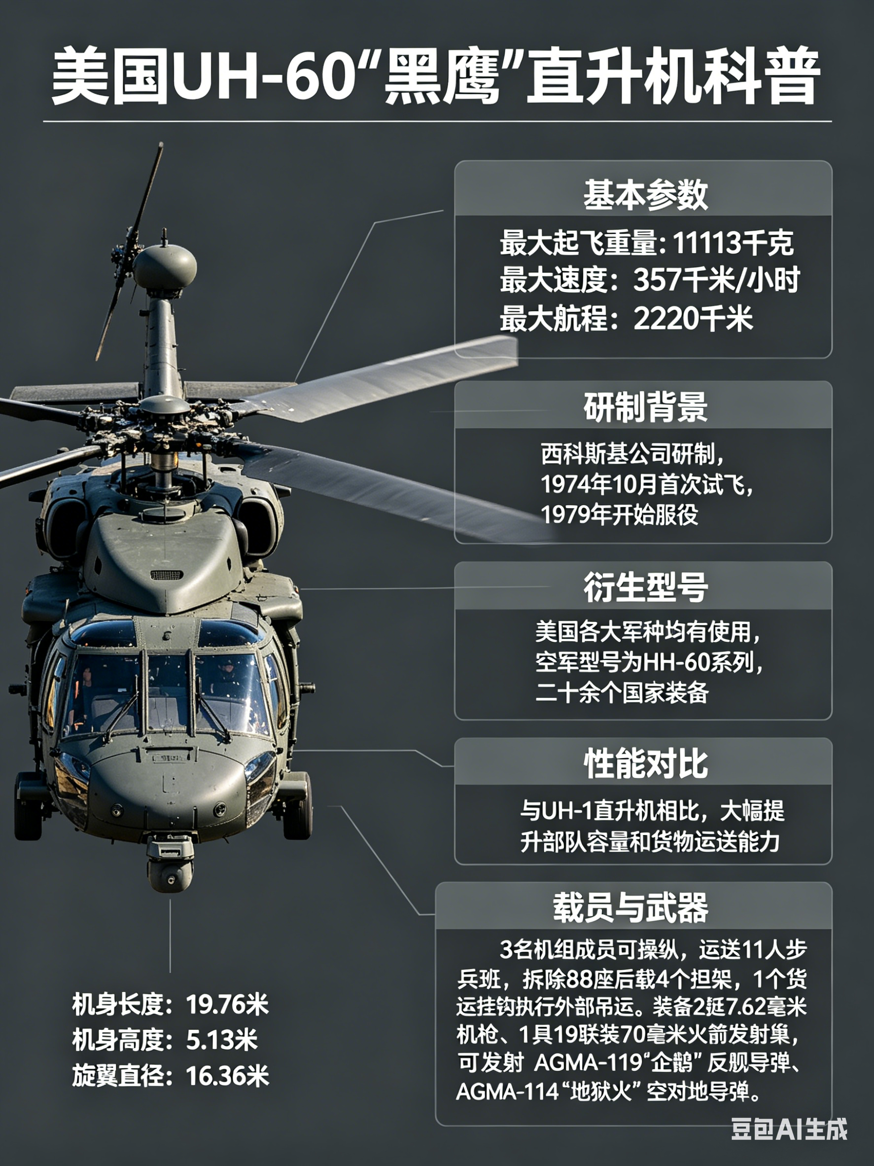 军事ai新视野 美国UH-60“黑鹰”直升机机身长度:19.76米机身高度:5.