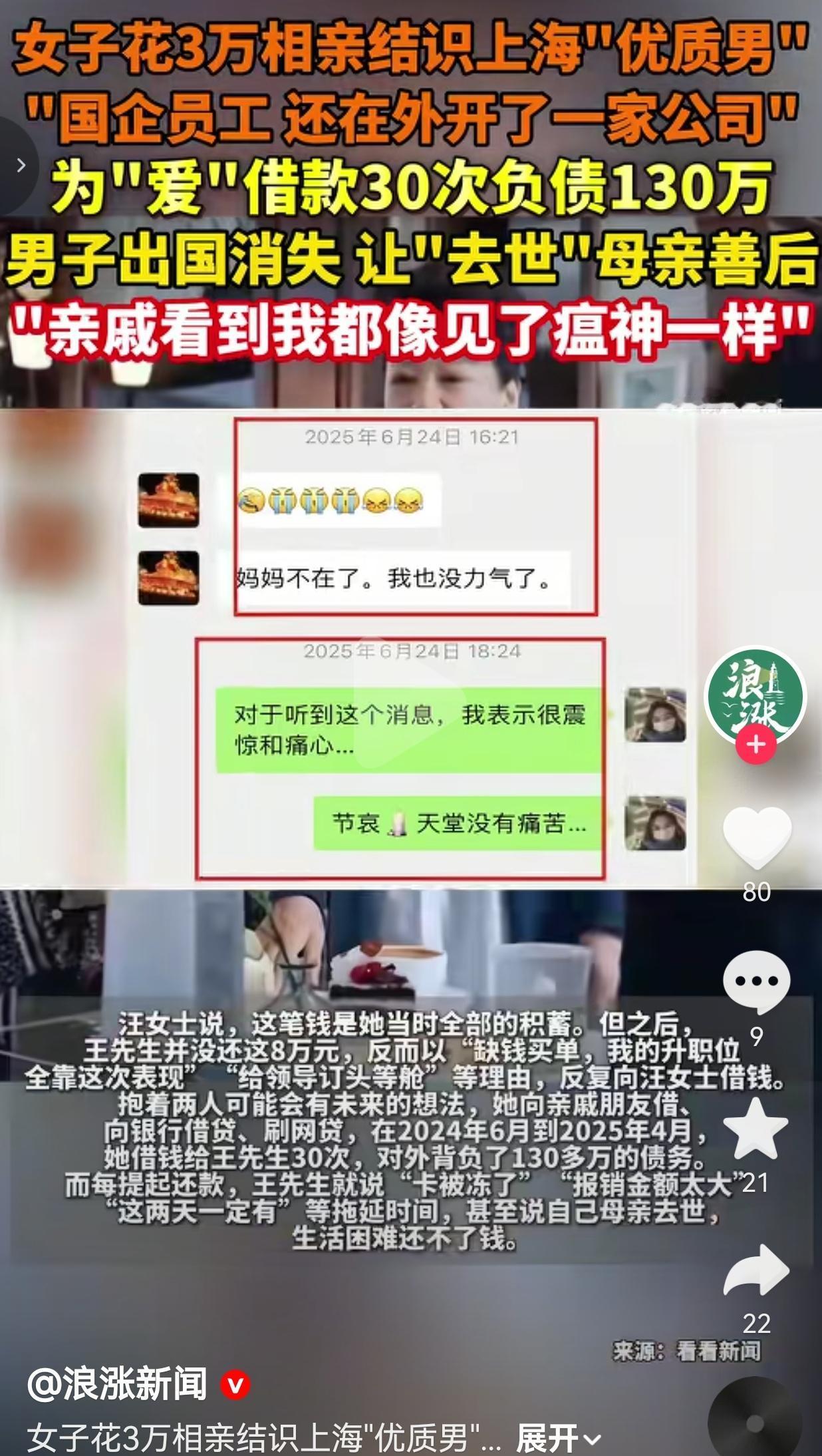 吓出冷汗!上海一位汪女士,花3万块婚介费找对象,结果遇人不淑,被一个自称“国企经理、年入60万”的优质男,骗得负债130万、一贫如洗!亲戚看到她都避之不及、躲着走。网友:这哪里是找老公,这分明是掉进了连环骗局的火坑啊!