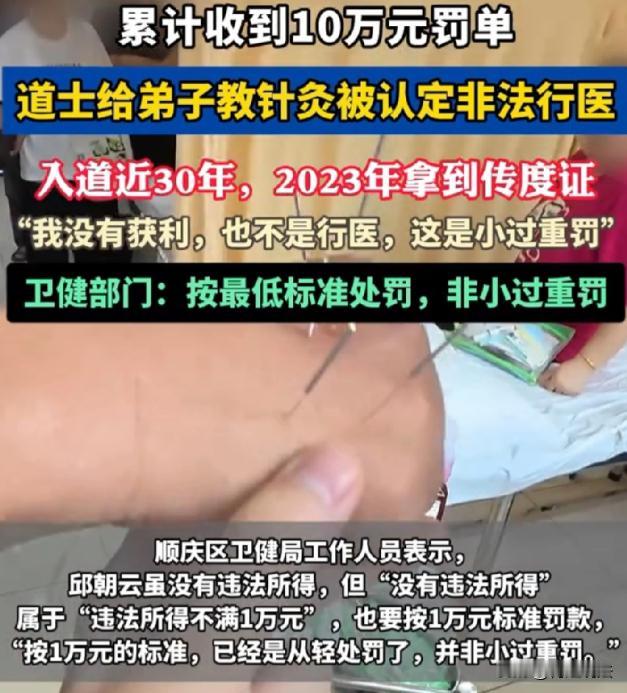 四川南充,一位61岁的老道爷,因为教徒弟针灸,被人举报非法行医,罚了5万。老头气不过,外出云游去了,结果罚款没交,又给加了5万,变成十万了!他这才急了眼,赶紧去申请复议,说罚得太重。