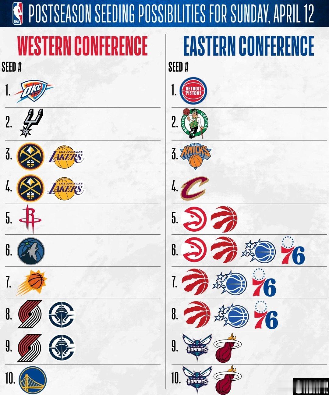 北京时间4月12日,NBA官方公布了常规赛全部最终排名可能性一览。