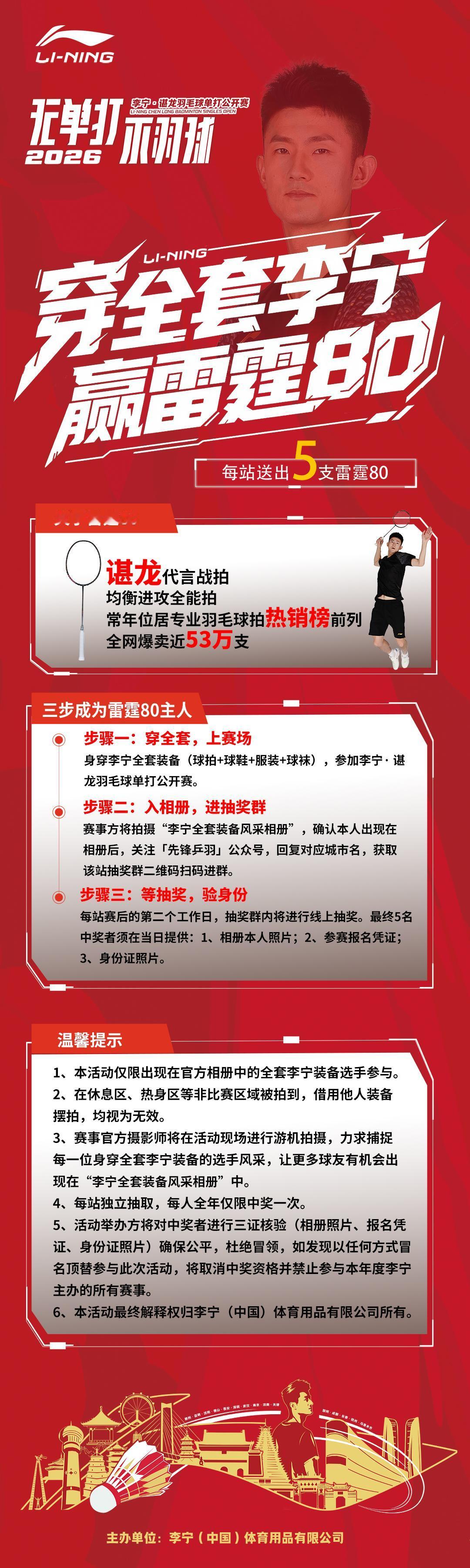 2026李宁·谌龙羽毛球单打公开赛 昆明、柳州双城挥拍 ! “穿全套李宁 赢雷霆