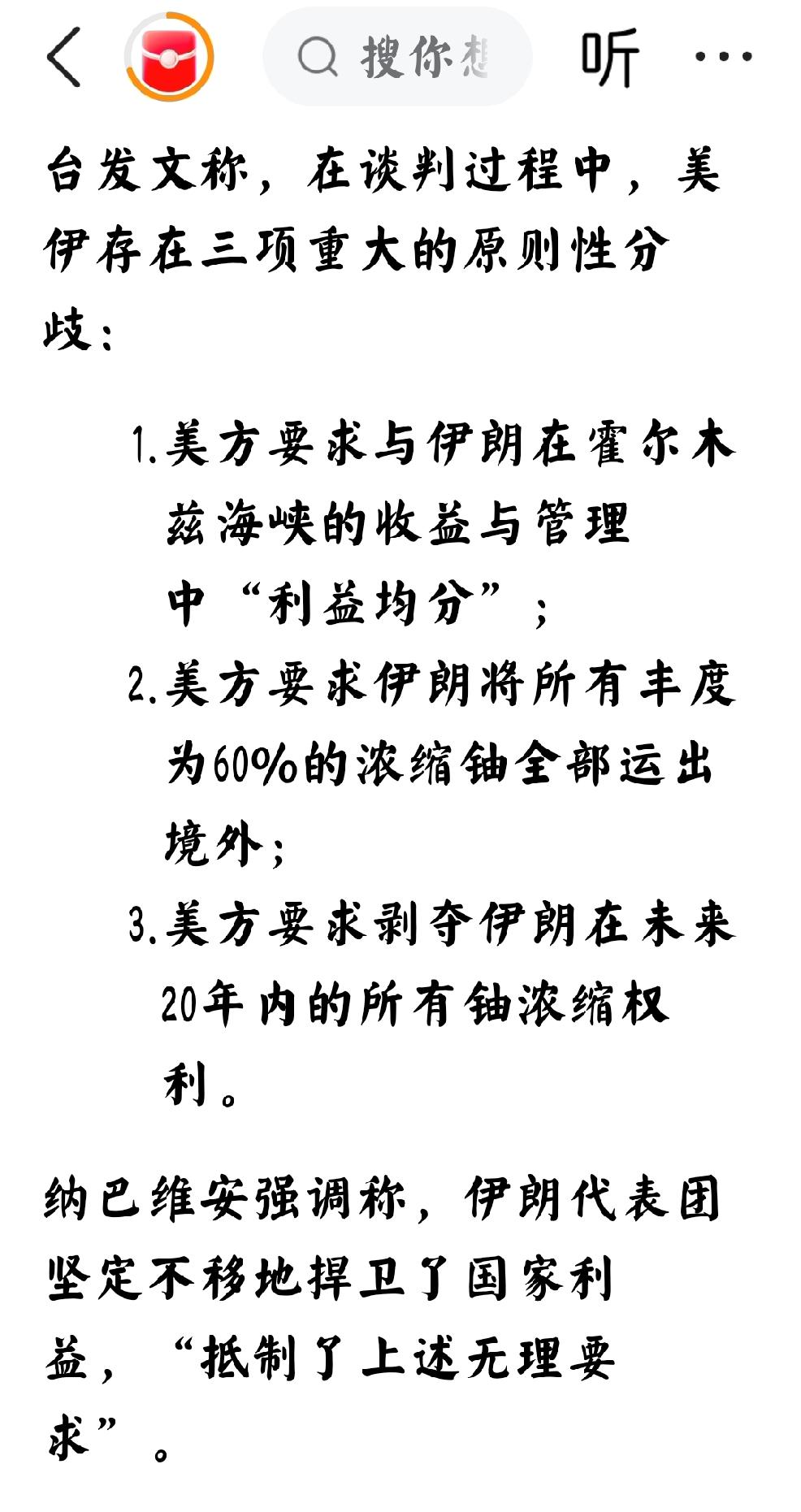 一,美方要求与伊朗在霍尔木兹海峡的收益与管理中“利益均分”