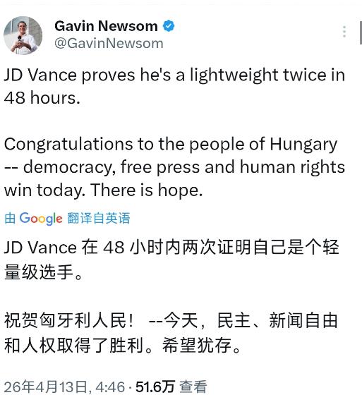 加州州长纽森今天(北京时间4月13日)写道:“JD·万斯在48小时内两次证明自己是个无足轻重的人物。向匈牙利人民表示祝贺——民主、自由媒体和人权在今天取得了胜利。希望犹存。”