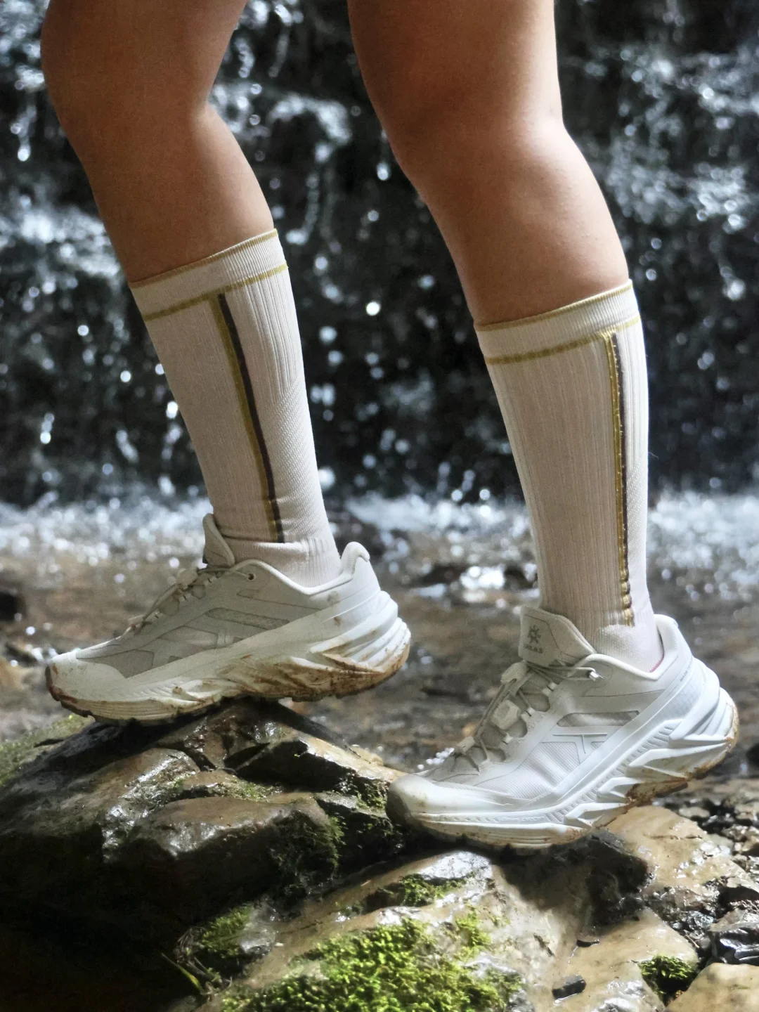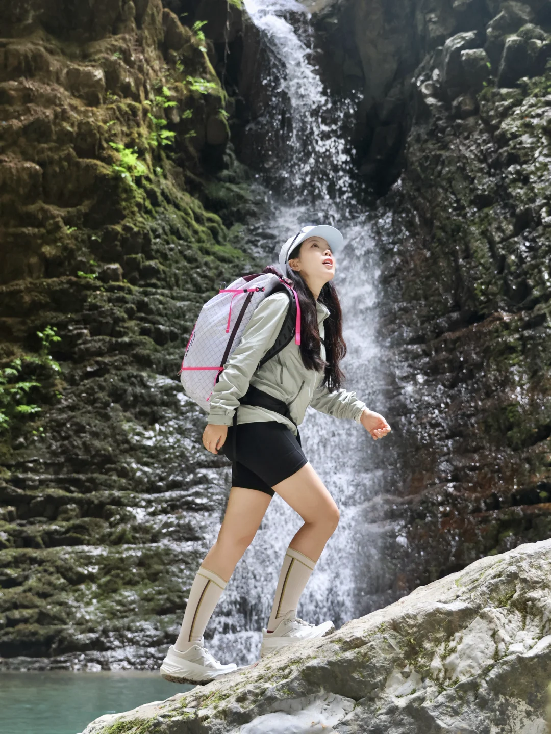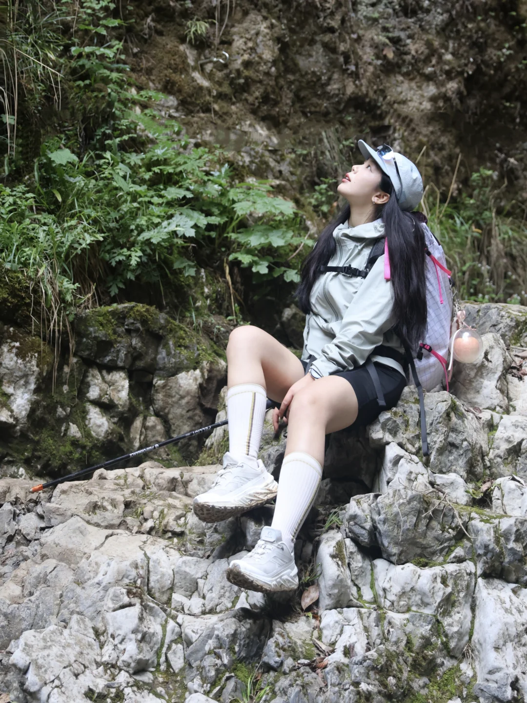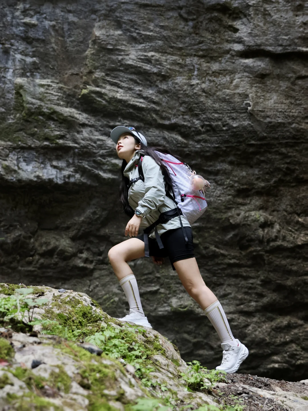 而且天坑洞地面全是湿滑青苔和常年滴水形成的钙化层,以前在这种路面我总得小心翼翼像企鹅一样走,但这次吸取了以往的经验,穿了一双防滑的徒步鞋。我这双是凯乐石山行的新款,Vibram大底像吸盘一样,可以牢牢咬住岩石,湿滑路面也能走得很稳当。而且这双鞋也又轻又透气,包裹感也不错,走久了也不会累脚闷脚