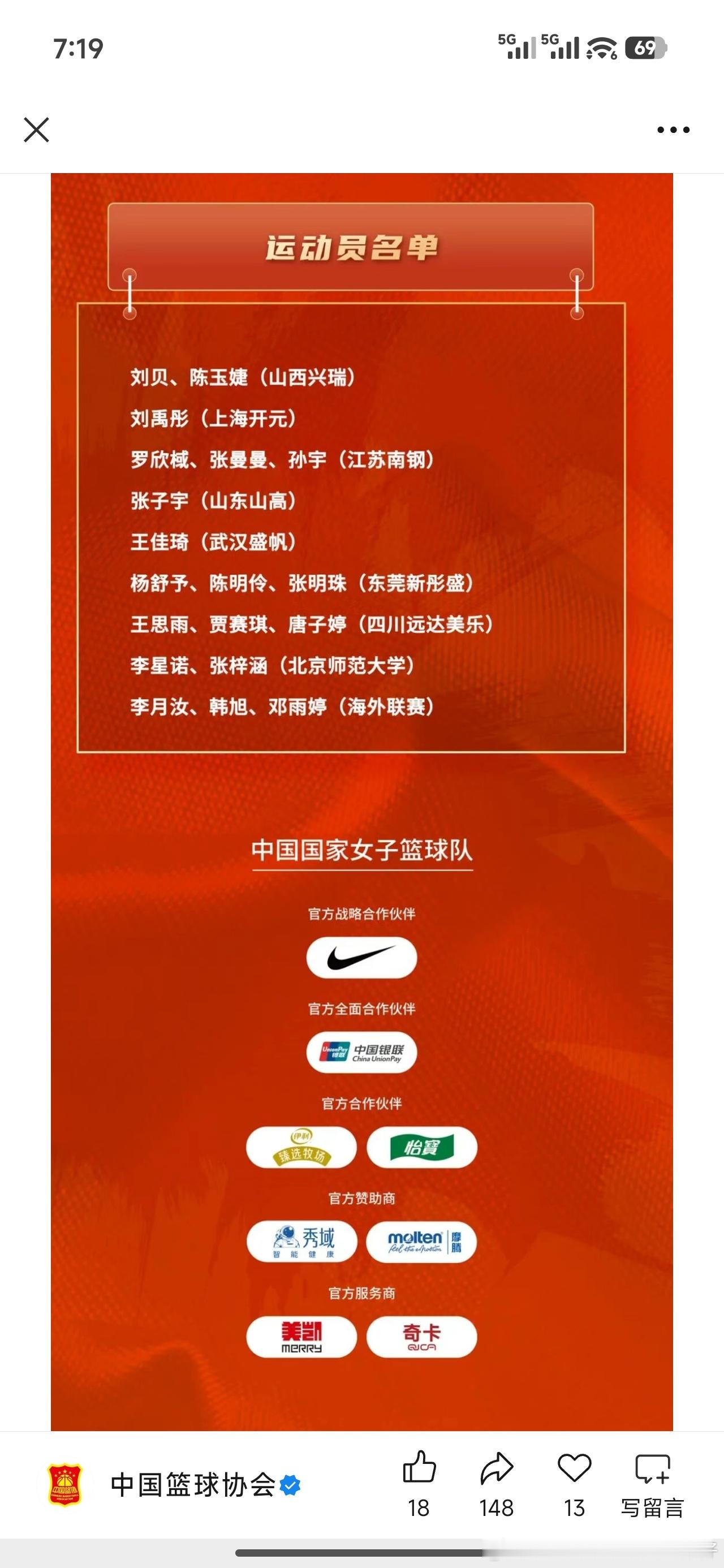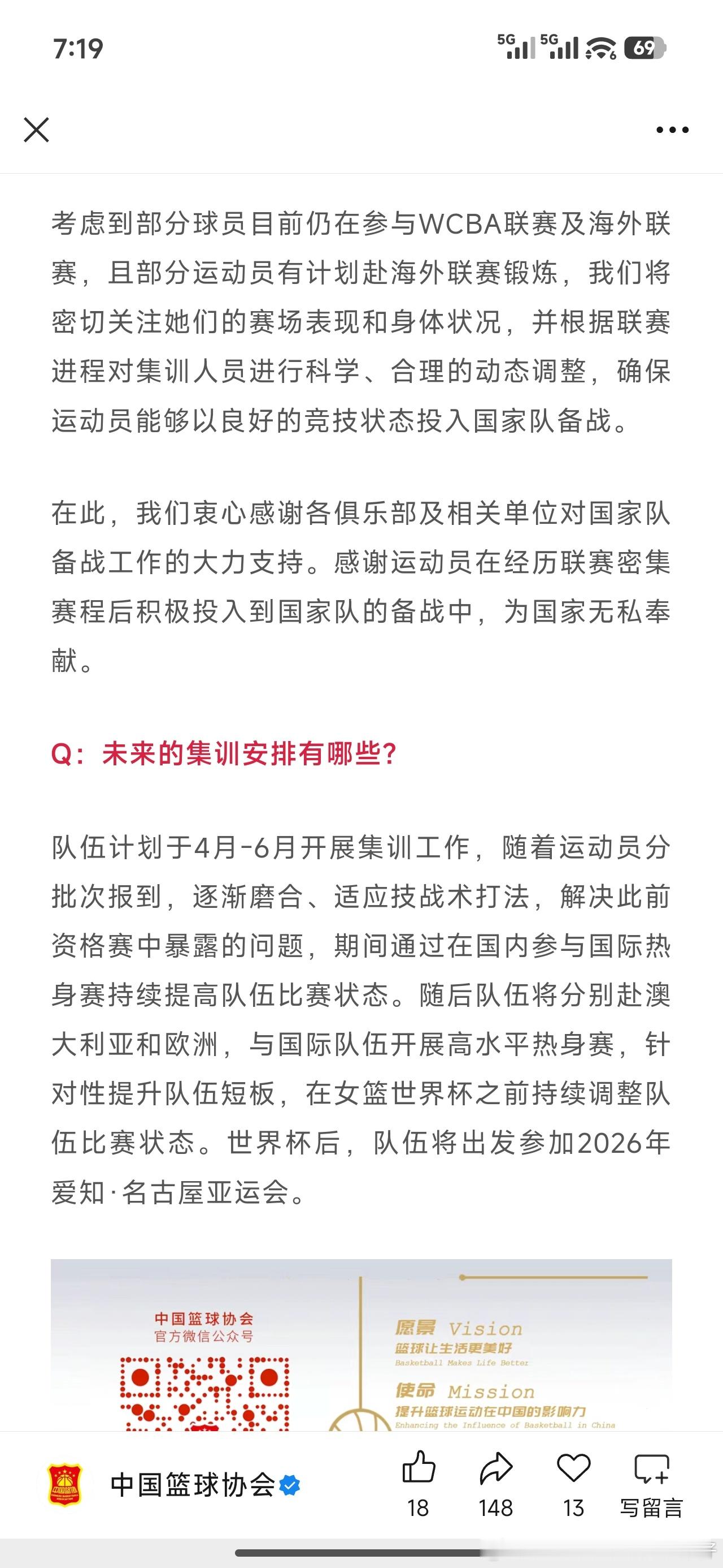 为备战2026年国际篮联女篮世界杯及爱知·名古屋亚运会,中国篮球协会将于2026年4月15日起在北京体育大学组织国家女篮集训选拔工作。结合2025-26赛季WCBA联赛推进情况,国家女篮教练组将依据队员在联赛中的竞技状态、队伍位置需要及集训表现,对集训人员进行动态调整。队伍计划于4月至6月在北京分批次开展集训,期间将在国内参与国际热身赛,随后分别赴澳大利亚和欧洲进行热身赛,热身赛后前往德国柏林参加女篮世界杯。世界杯结束后,队伍将出发参加2026年爱知·名古屋亚运会。中国女篮