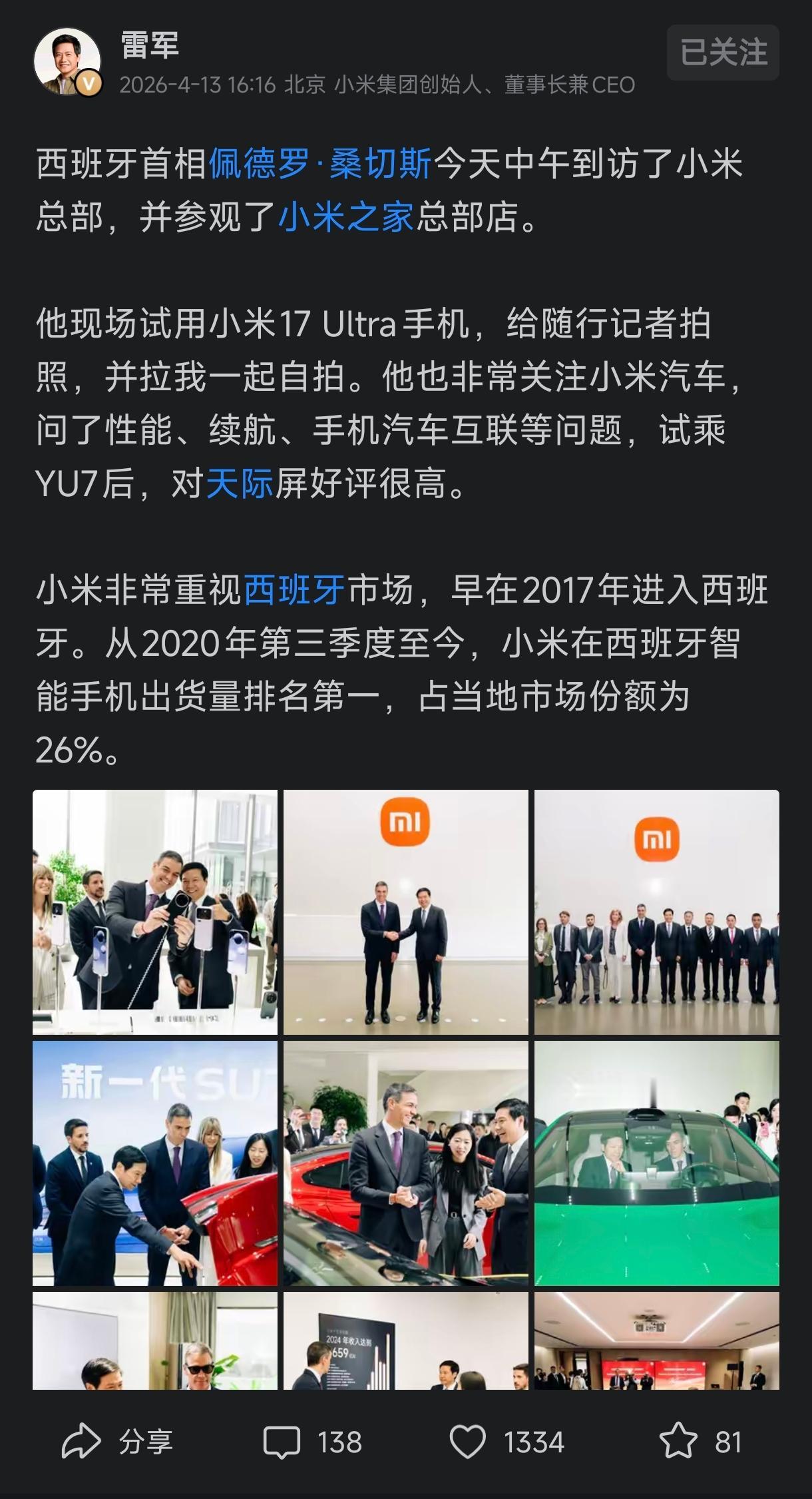 桑切斯参观小米时说"西班牙有极具竞争力的工业和物流生态系统,可以为中国和西班牙之间高级别的技术协作保驾护航。",婉转对无核心技术的小米给了很低的评价。郑丽文参观时也看出杂牌没啥核心技术,所以说她老公是米粉,郑丽文情商很高啊,点赞![大笑]