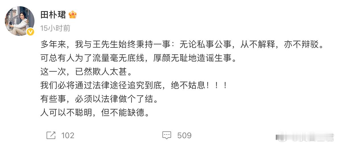 而后,田朴珺还不能平息心中的怒火,又继续发文,表示:“对此事一定追究到底,绝不姑息!人可以不聪明,但不能缺德!”