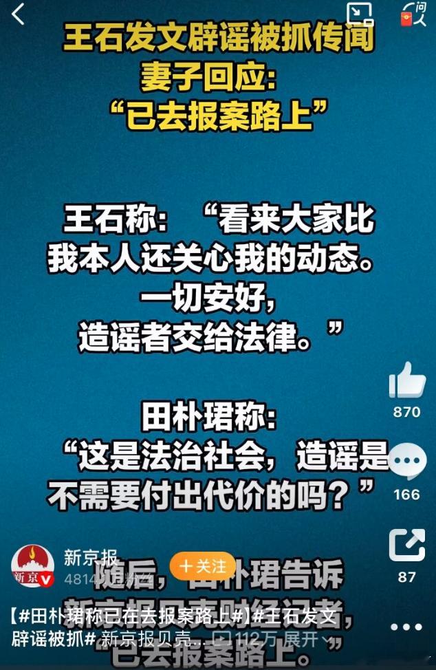 总之这个猛料被秦枫爆出来后,王石、田朴珺彻底怒了。首先是田朴珺,她是先出来表示,现在是法治社会,造谣是需要付出代价的!