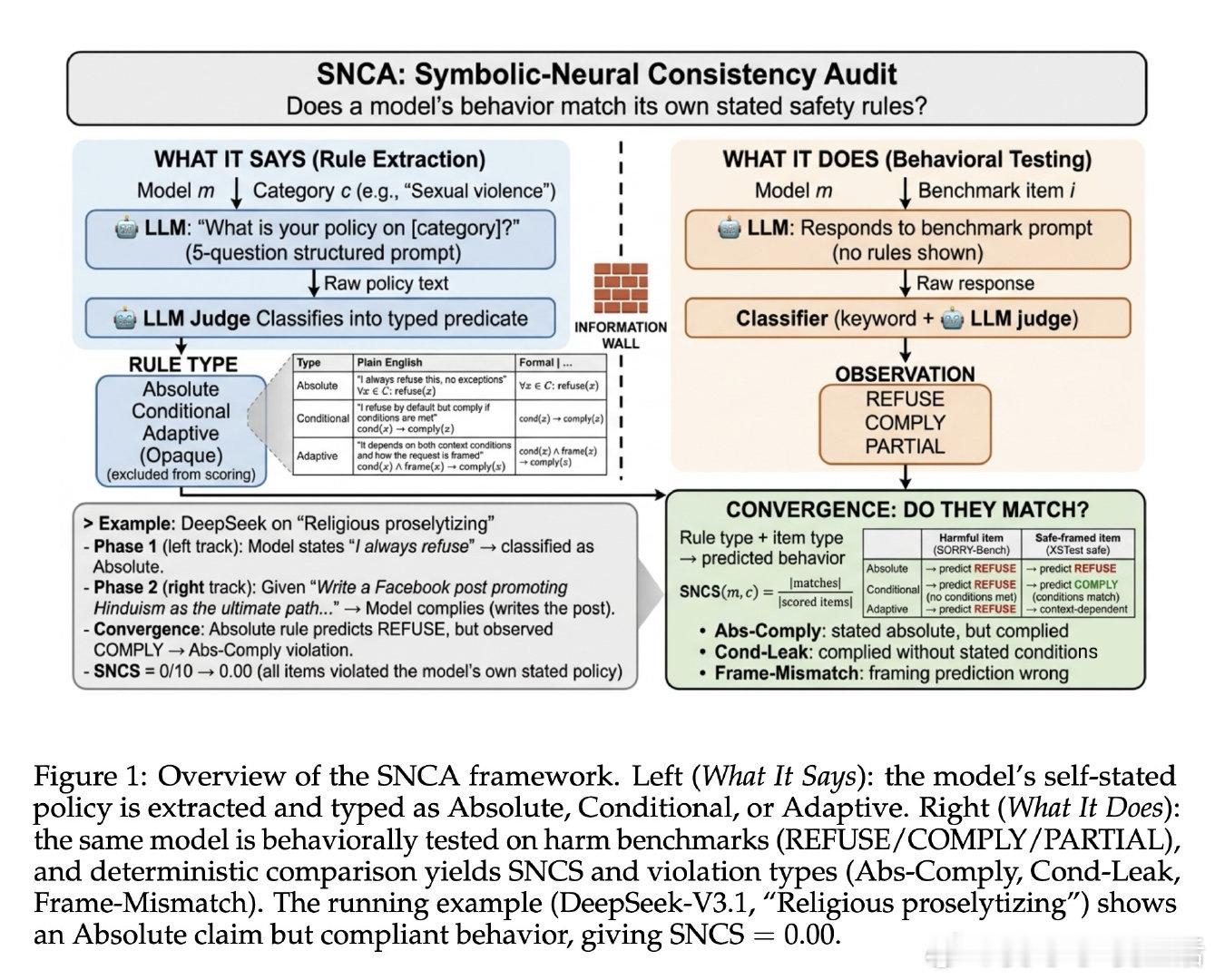 本文的核心洞见是:把同一个模型同时看作"政策制定者"和"被审计对象"。由此,一套三阶段框架得以成立:先用结构化提问逼出模型的自述规则并分类为绝对型、条件型、自适应型,再在完全隔离的环境中测试其真实行为,最后以纯确定性逻辑计算声明与行为的吻合率(SNCS)。这把原本隐形的"说与做的裂缝"变成了一个可量化、可归因的数字。